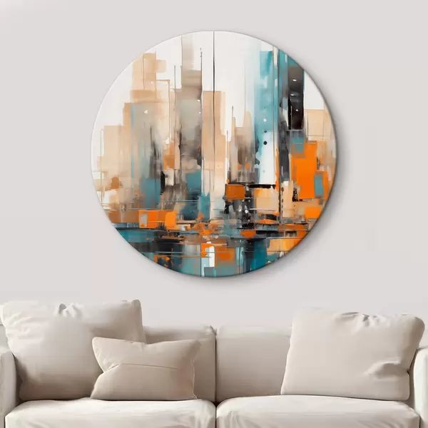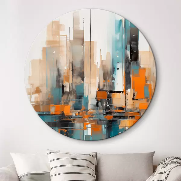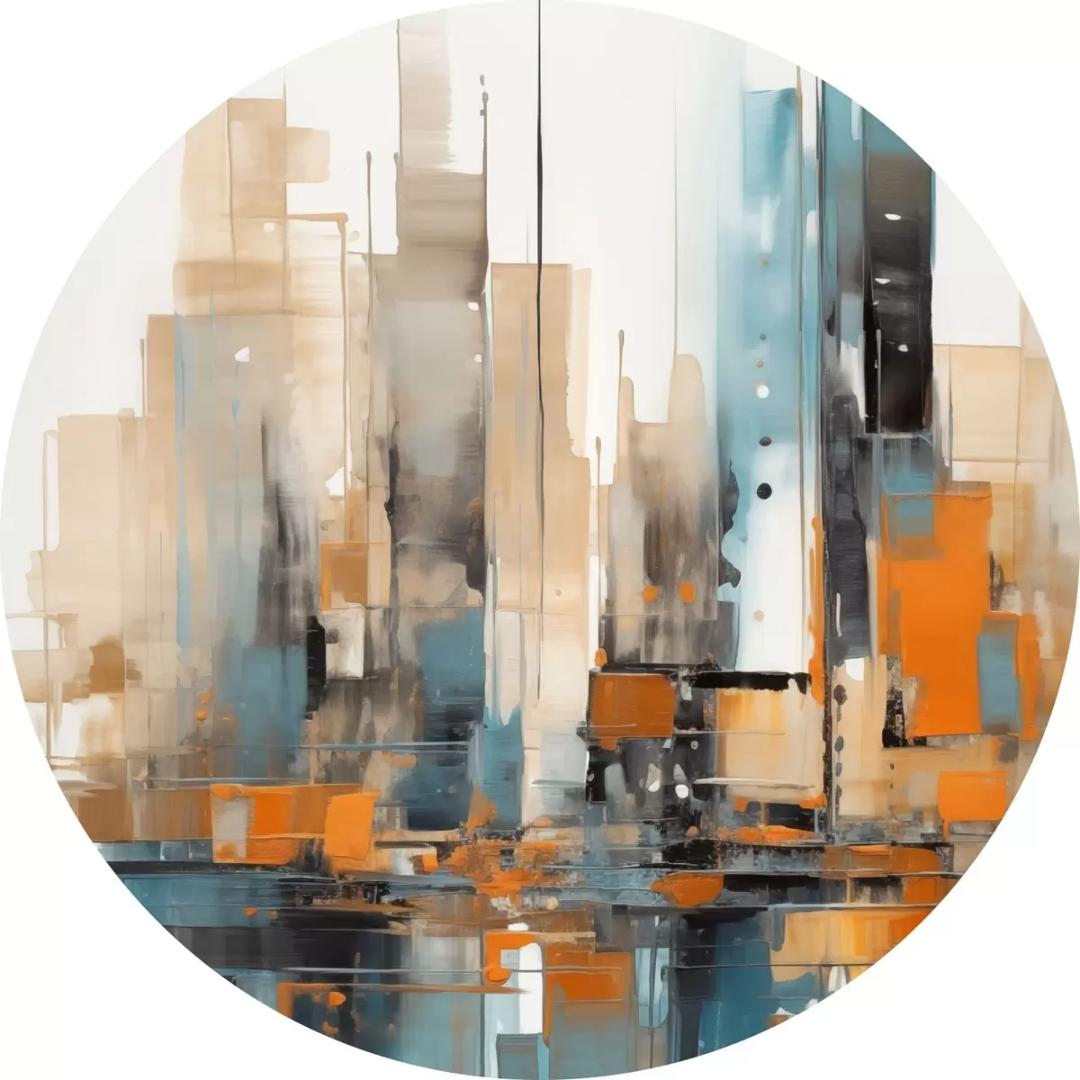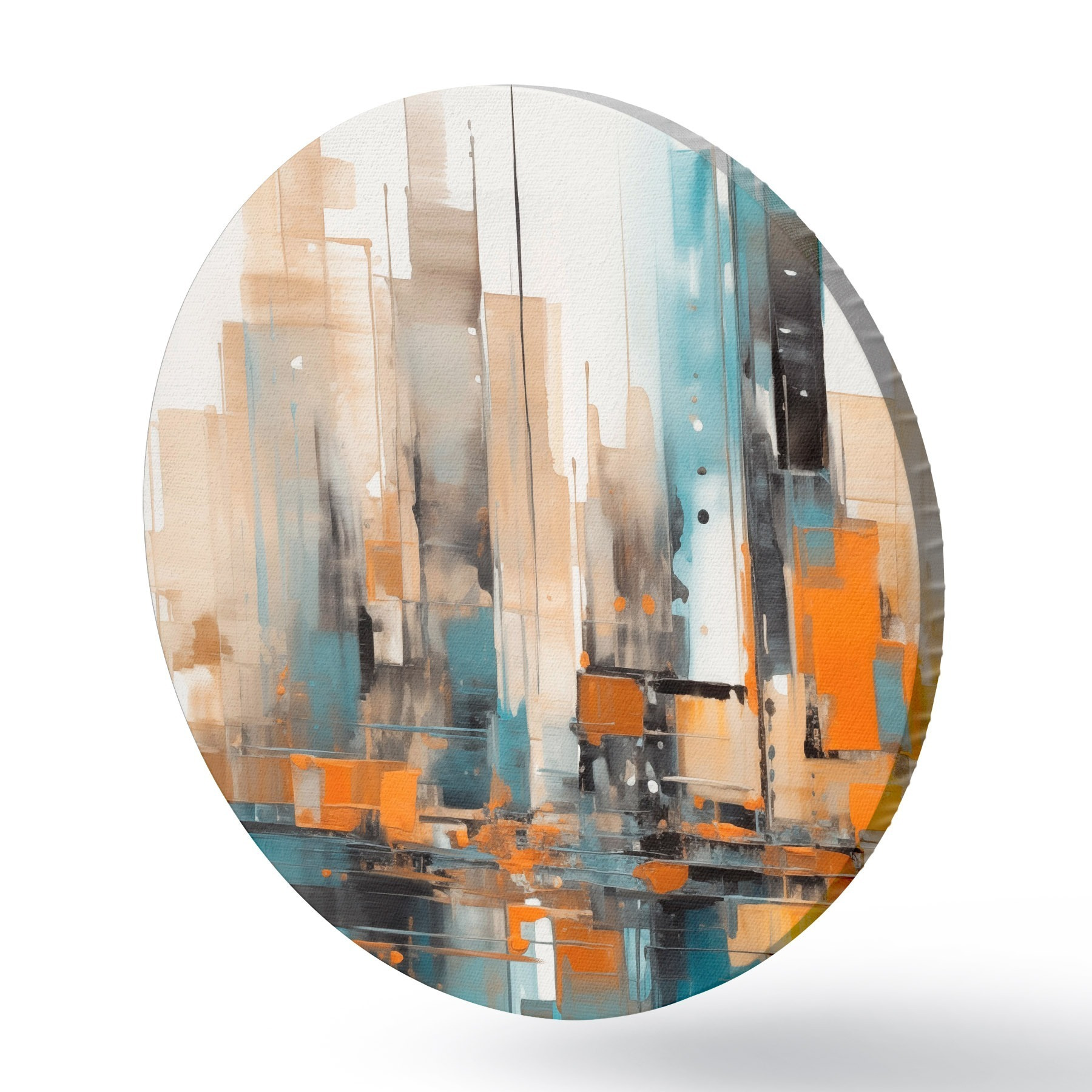 Quadri rotondi Paesaggio urbano astratto con pennellate verticali arancioni, verde acqua e marroni e forme geometriche r46266