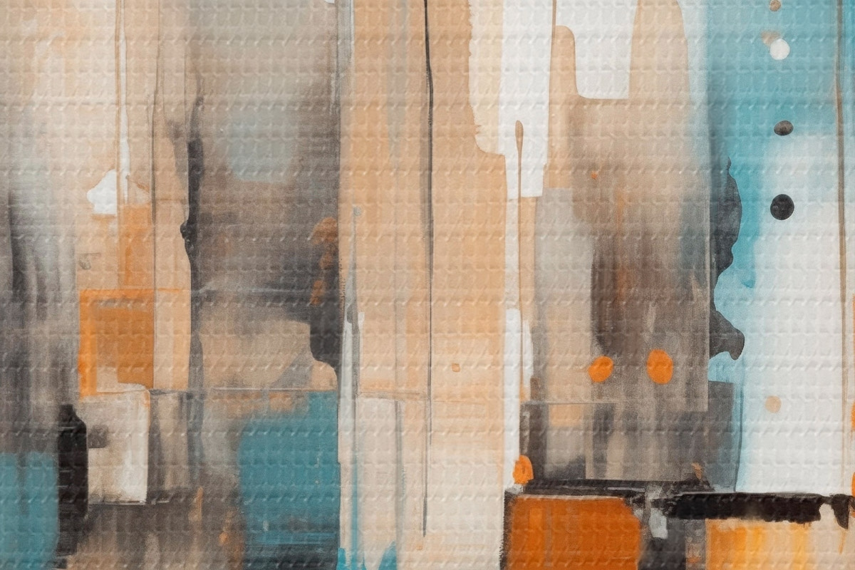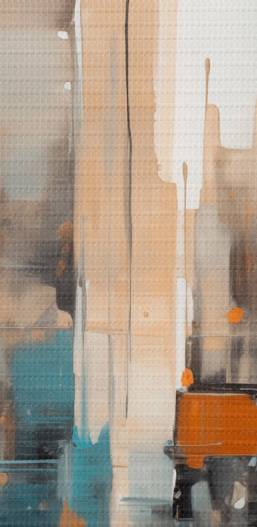Immagine Paesaggio urbano astratto con pennellate verticali arancioni, verde acqua e marroni e forme geometriche Nr r46266