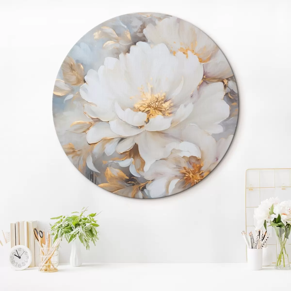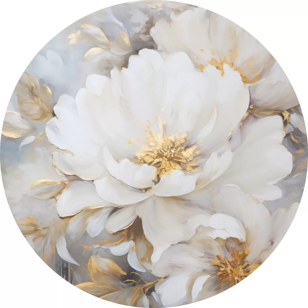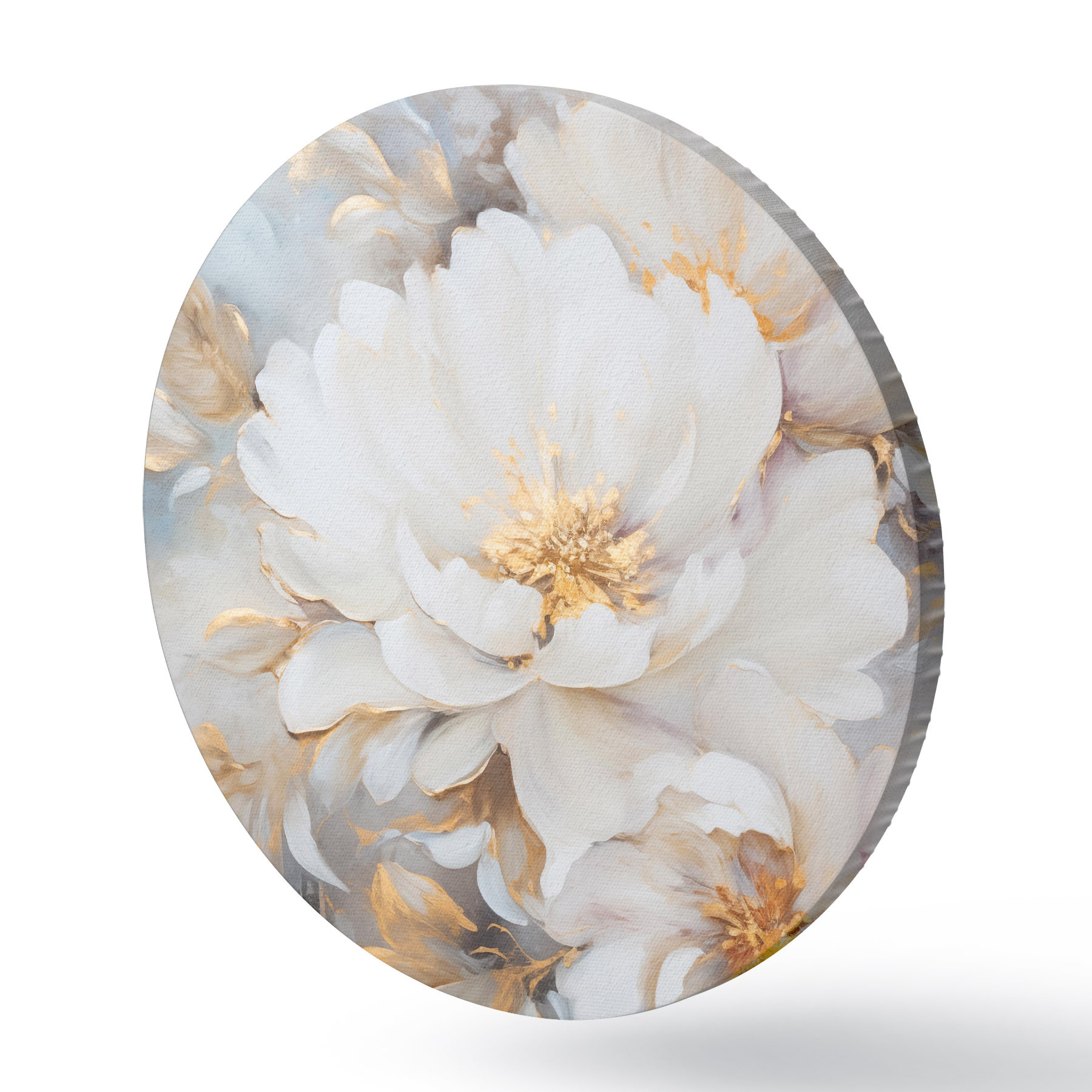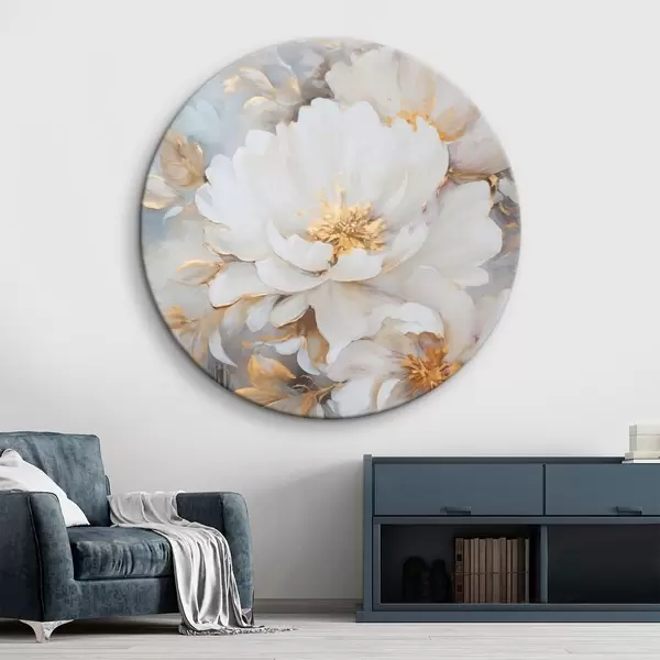 Quadri rotondi Peonie bianche con centro e foglie blu, pennellate morbide, sfondo azzurro, composizione floreale r46271