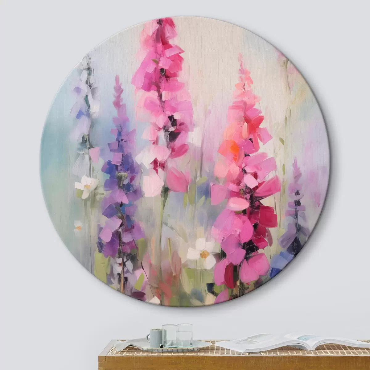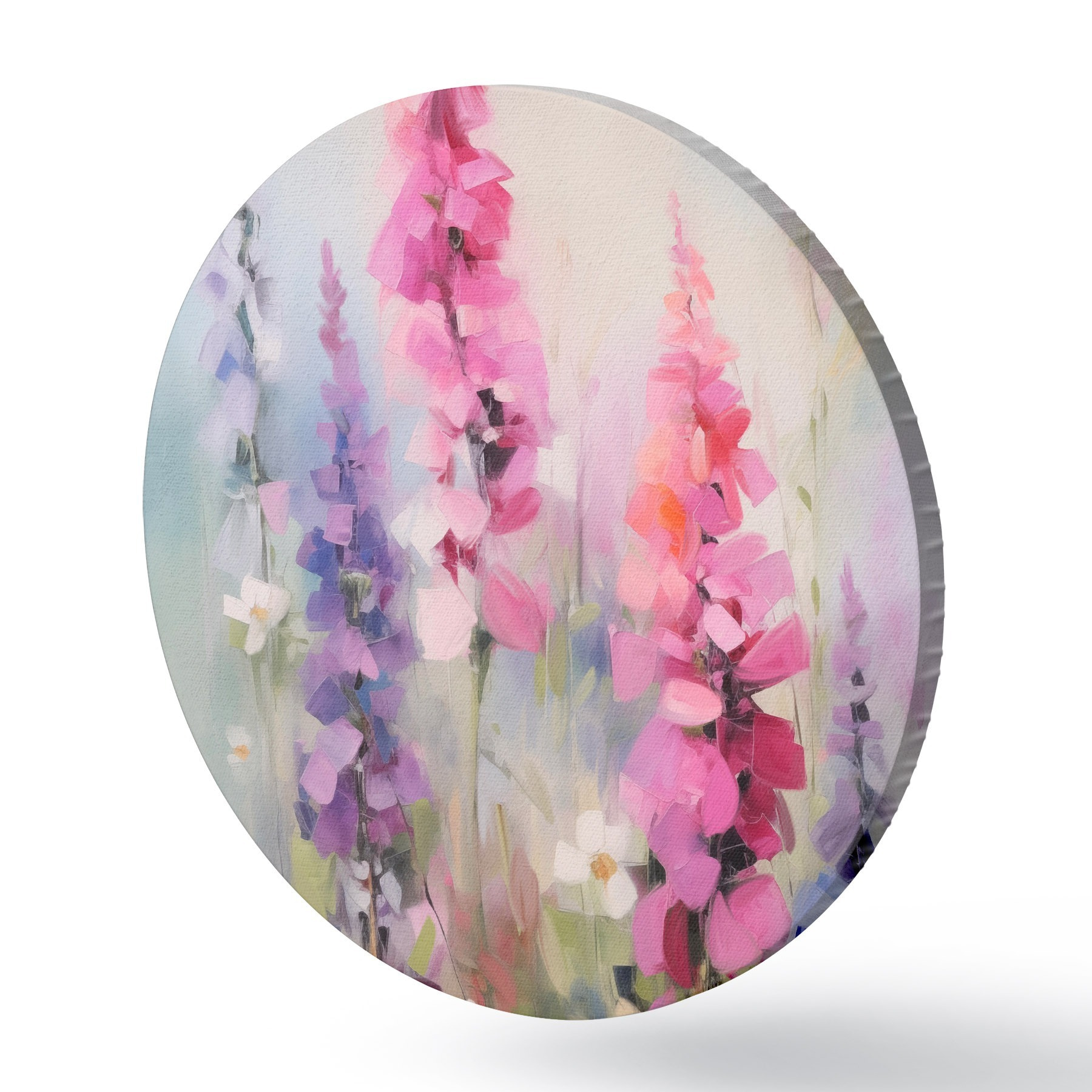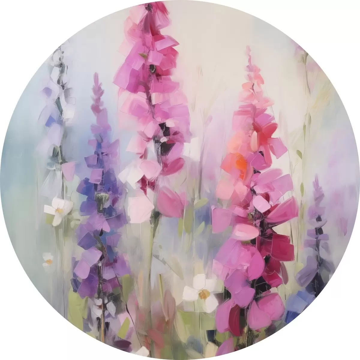 Quadri rotondi Fiori rosa e viola con margherite bianche in un campo, pennellate morbide, colori pastello, stile impressionista r46279