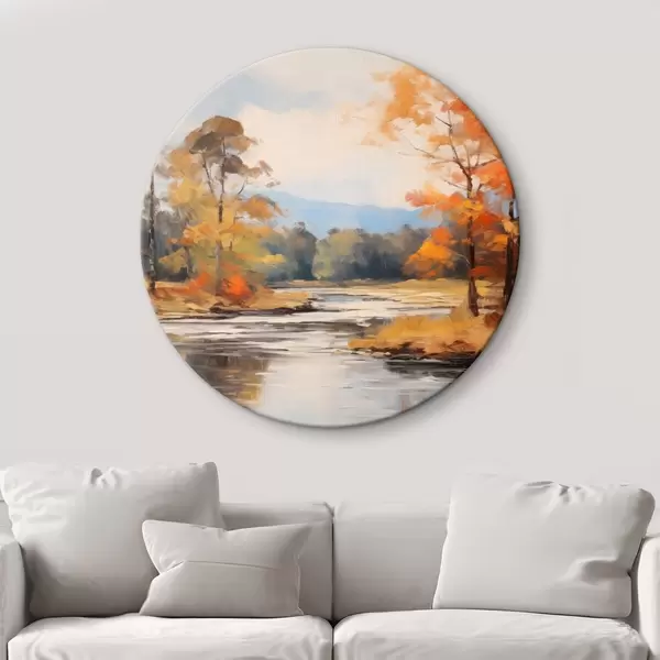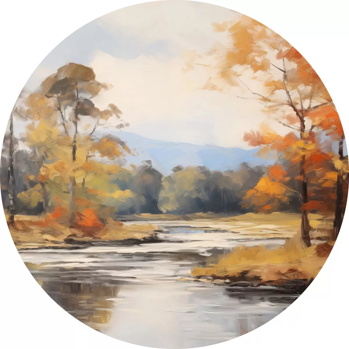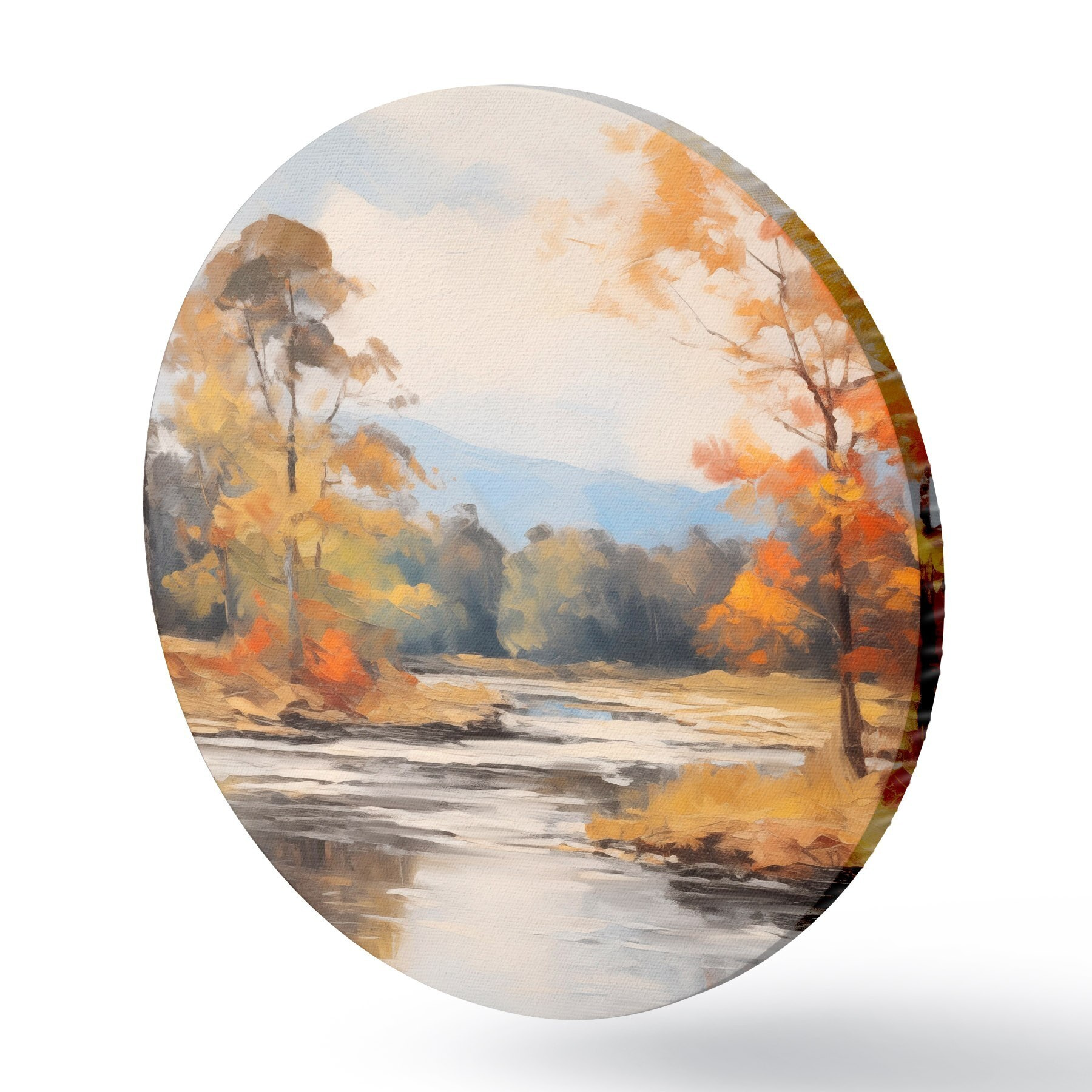Quadri rotondi Paesaggio con un fiume che scorre attraverso una foresta in autunno, alberi gialli e arancioni, stile pittorico r46281