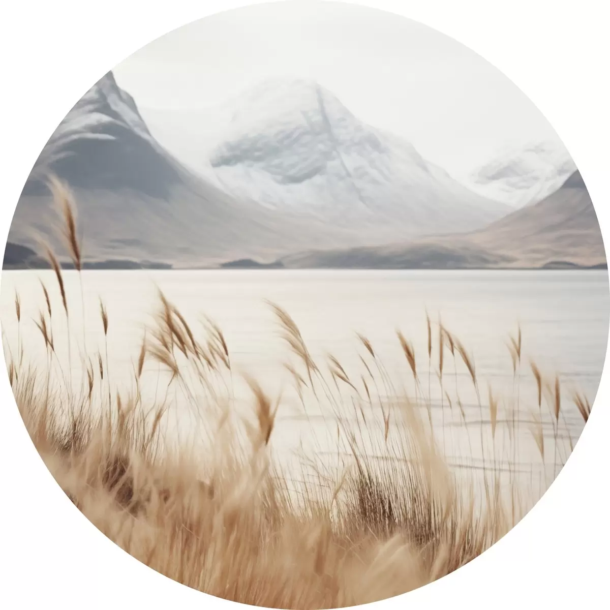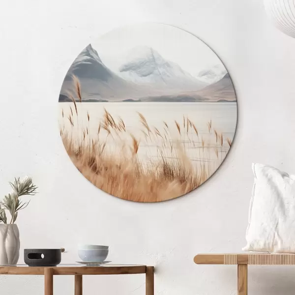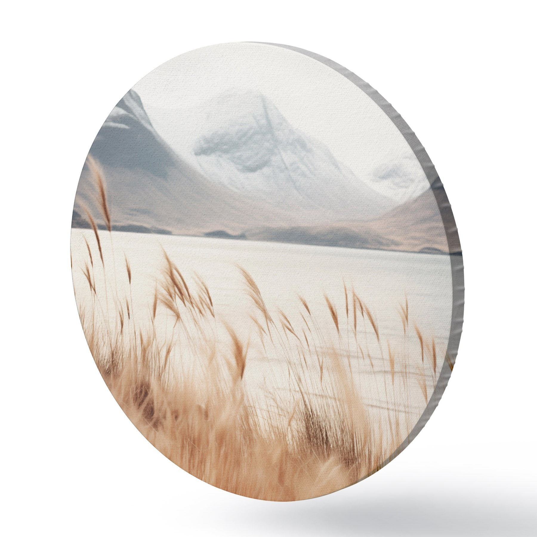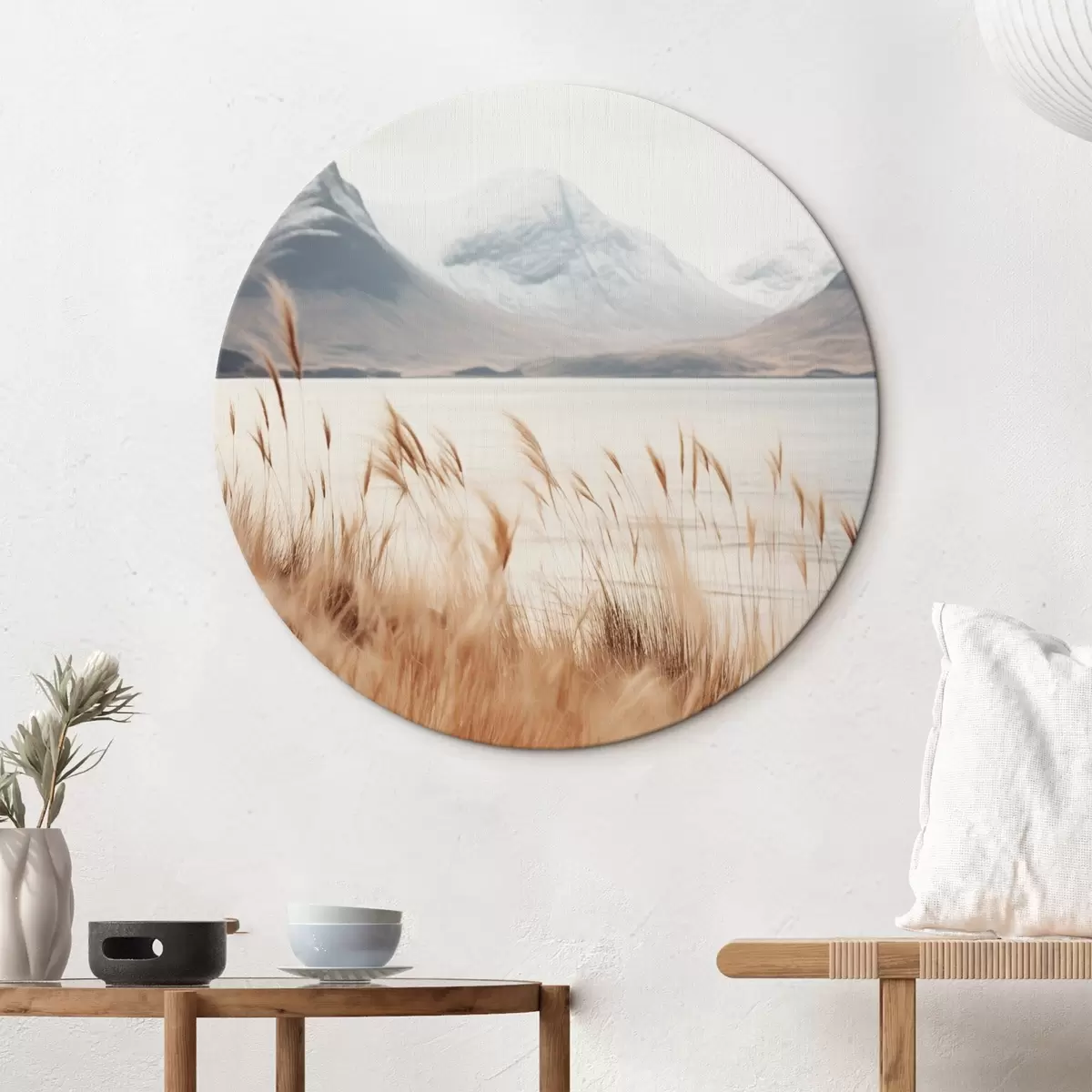 Quadri rotondi Campo di erba della Pampa davanti a un paesaggio lacustre con montagne innevate sullo sfondo, luce soffusa r46282