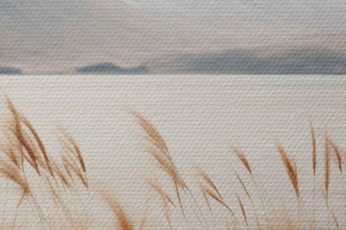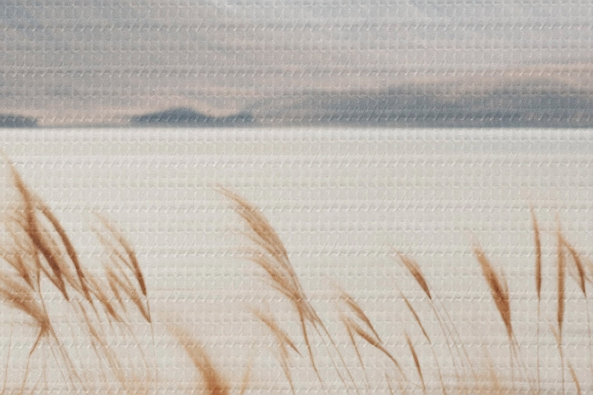 Immagine Campo di erba della Pampa davanti a un paesaggio lacustre con montagne innevate sullo sfondo, luce soffusa Nr r46282