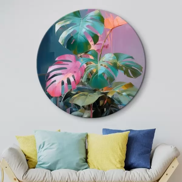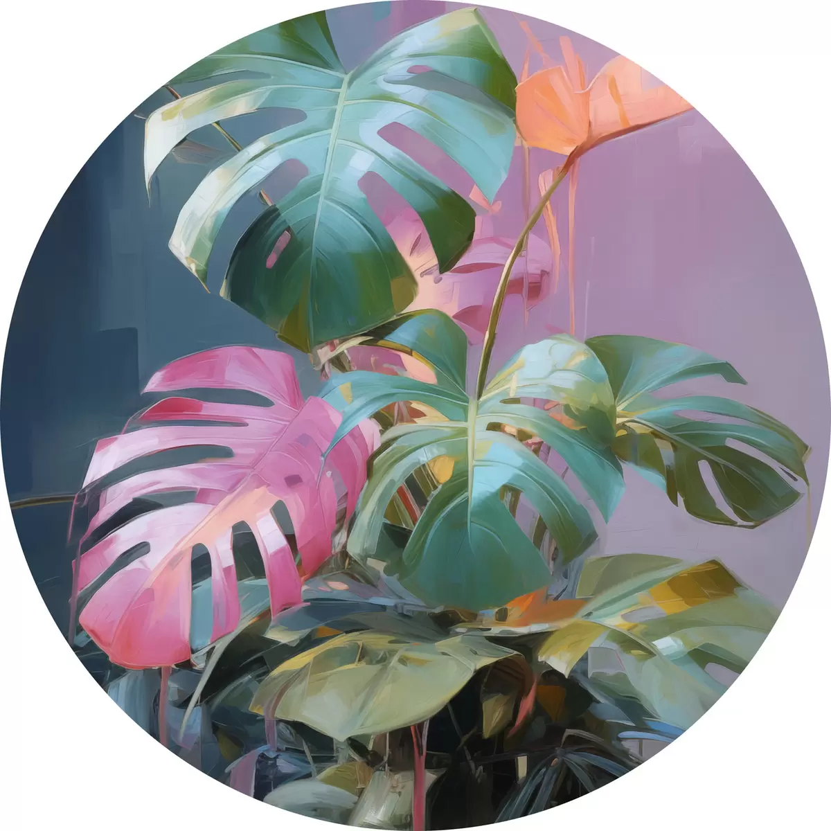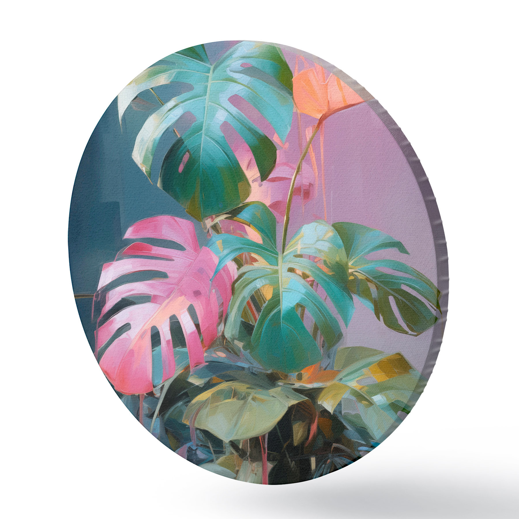 Quadri rotondi Pianta astratta di monstera con foglie rosa e verdi, colori vivaci, su sfondo sfocato r46287