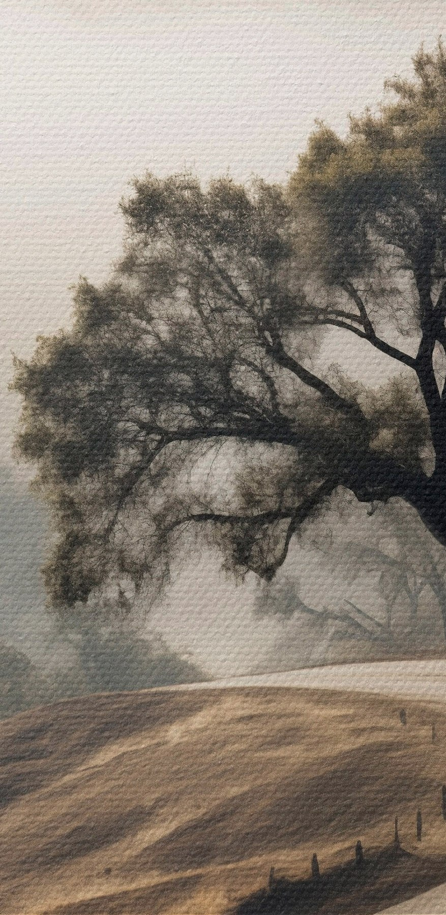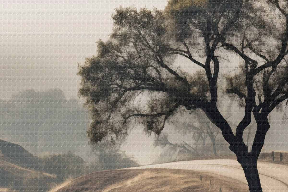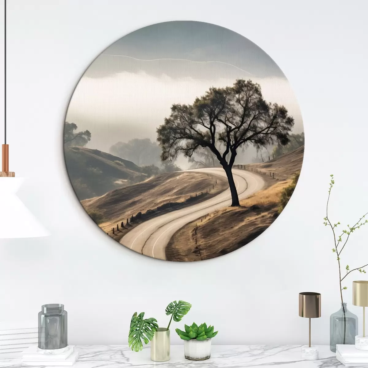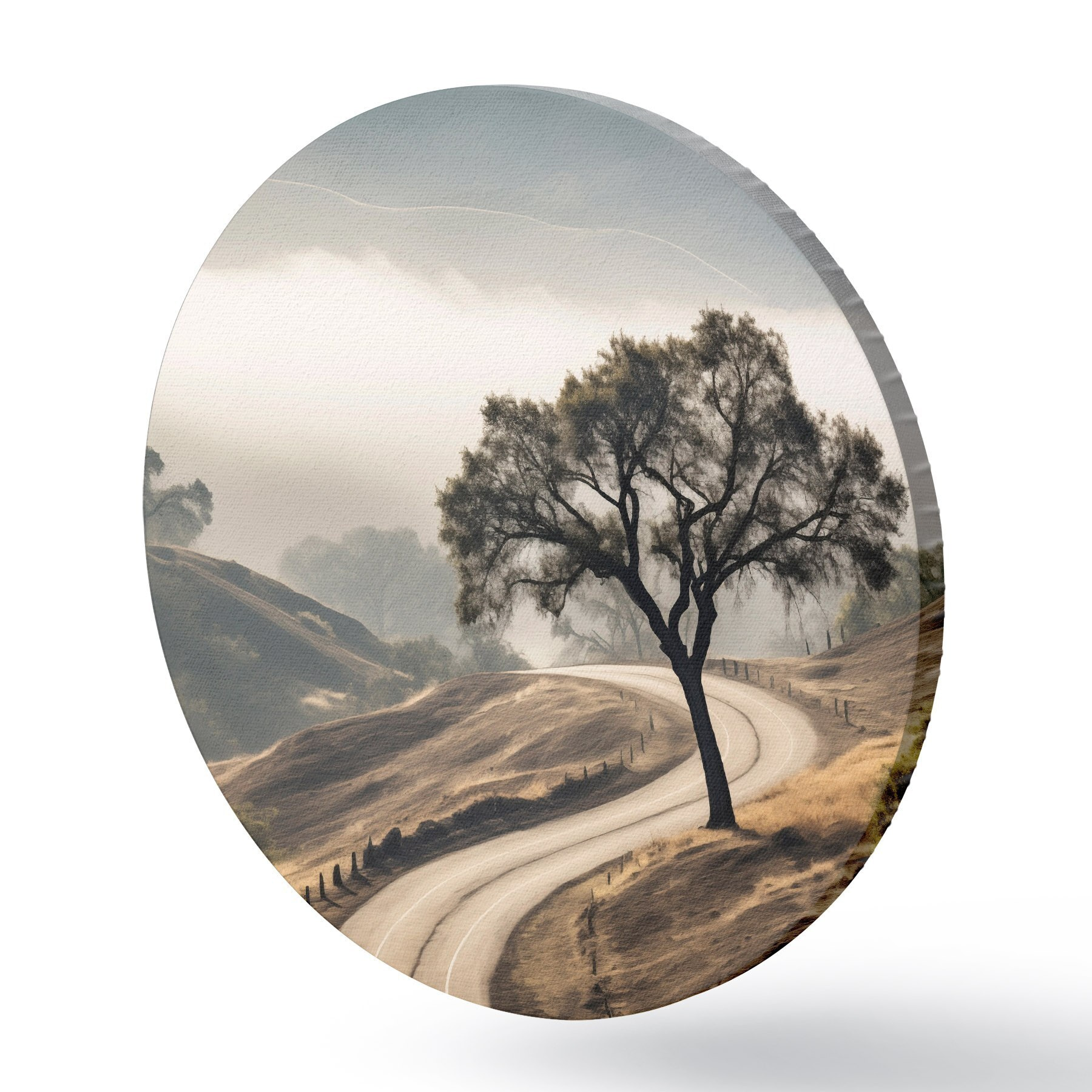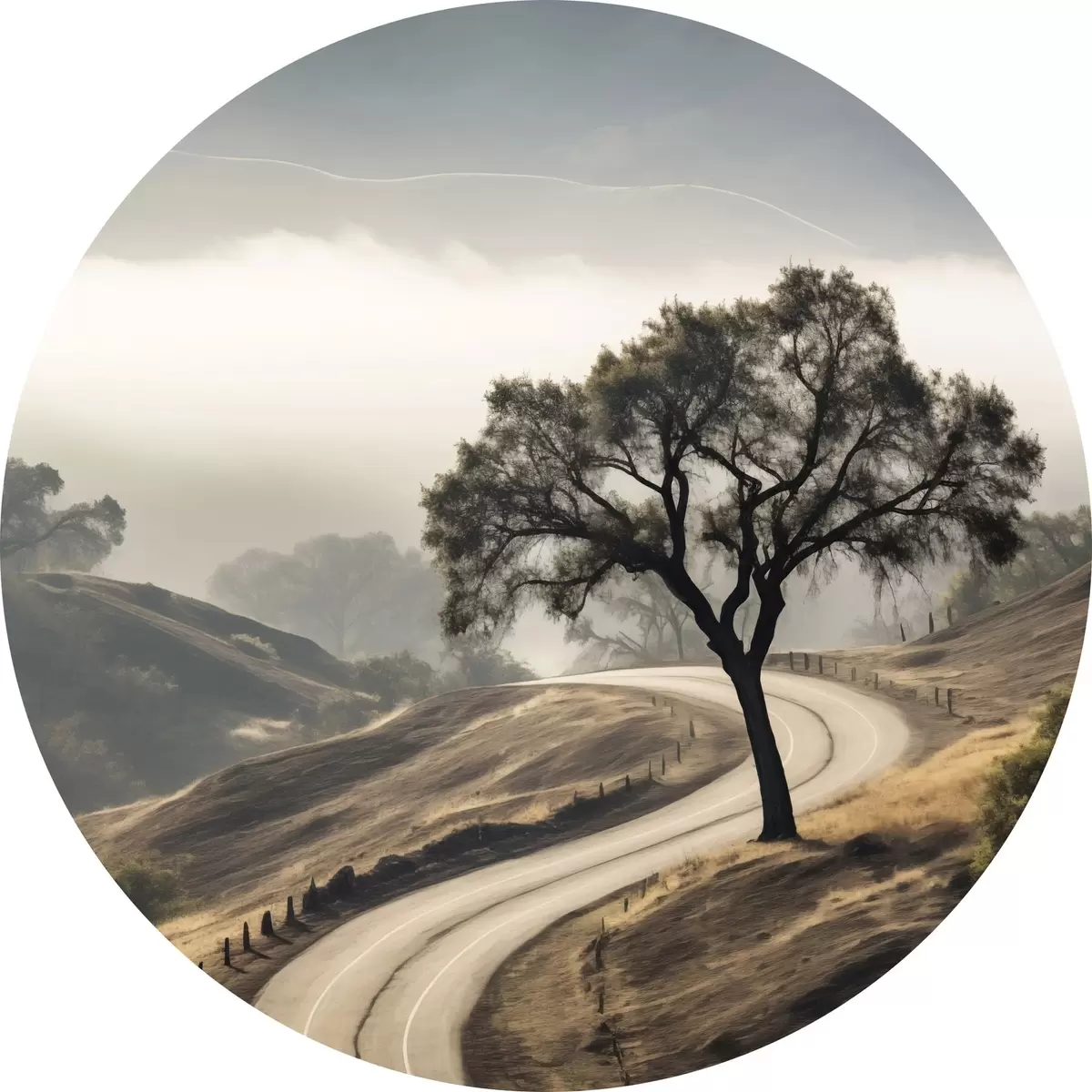 Quadri rotondi Una strada tortuosa che attraversa dolci colline con un albero in primo piano, sullo sfondo nebbia e montagne r46288