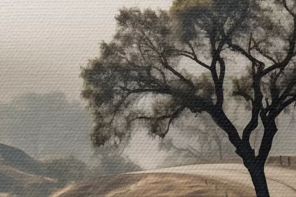 Immagine Una strada tortuosa che attraversa dolci colline con un albero in primo piano, sullo sfondo nebbia e montagne Nr r46288