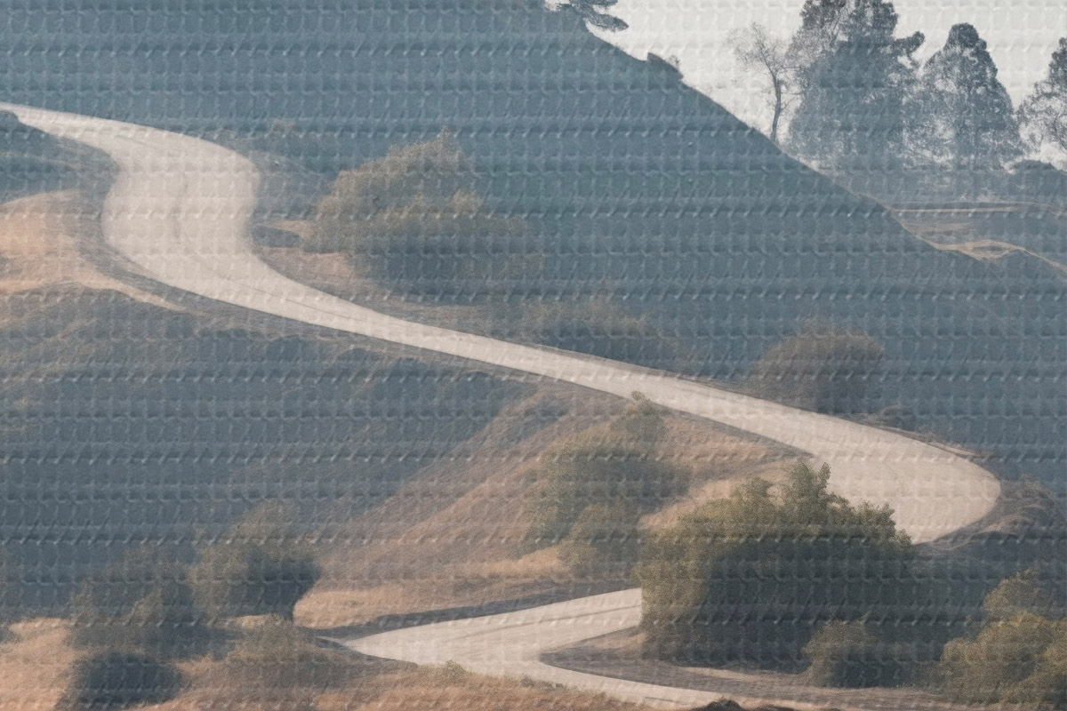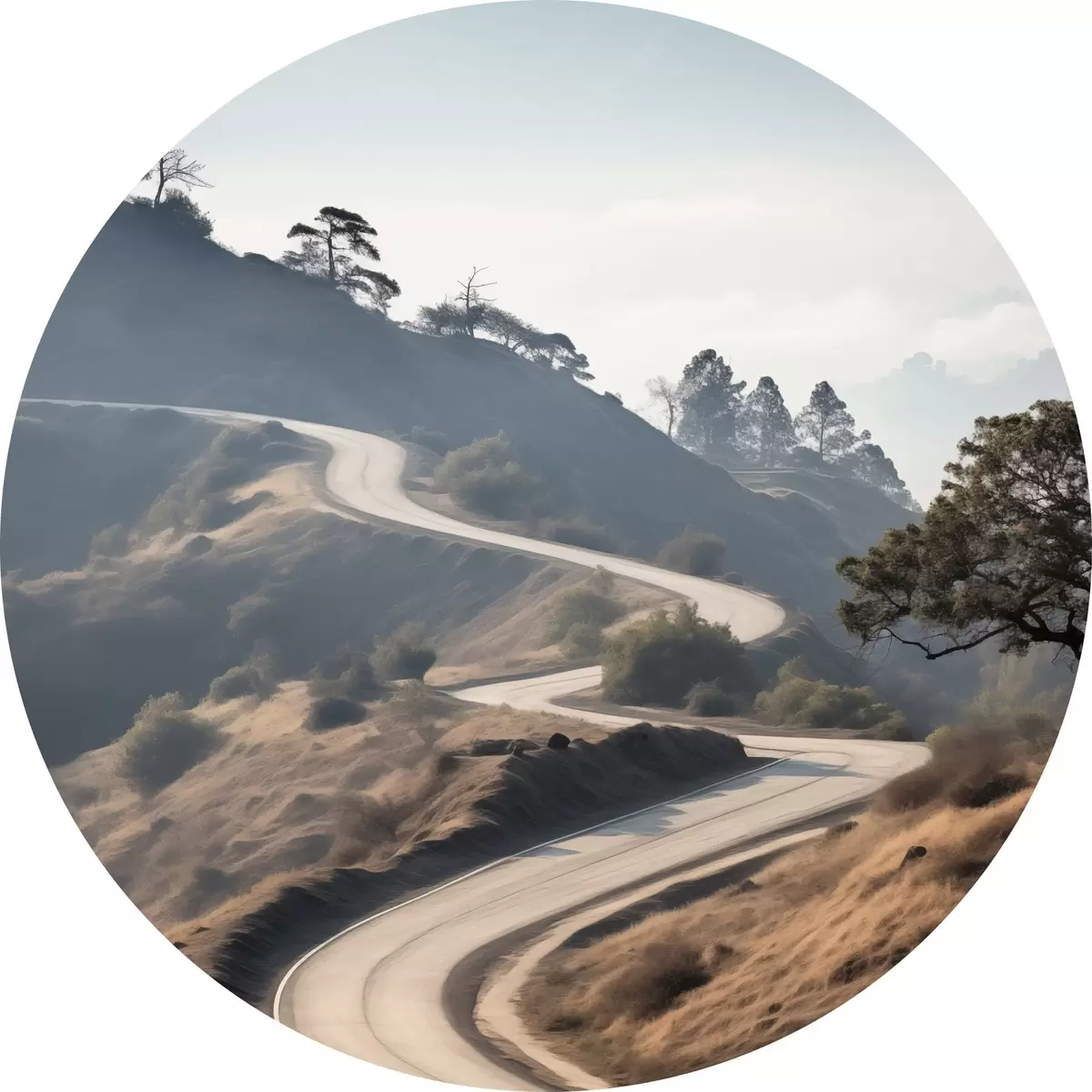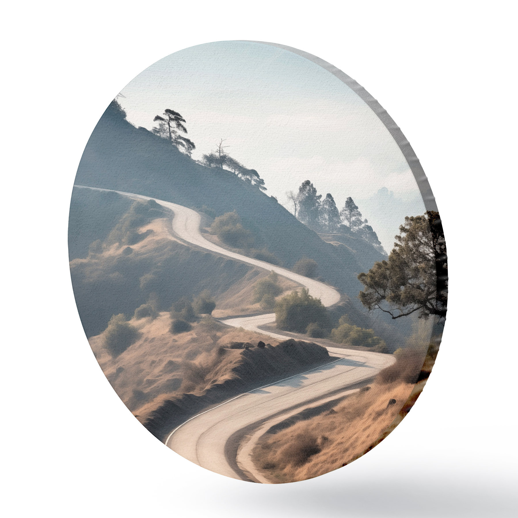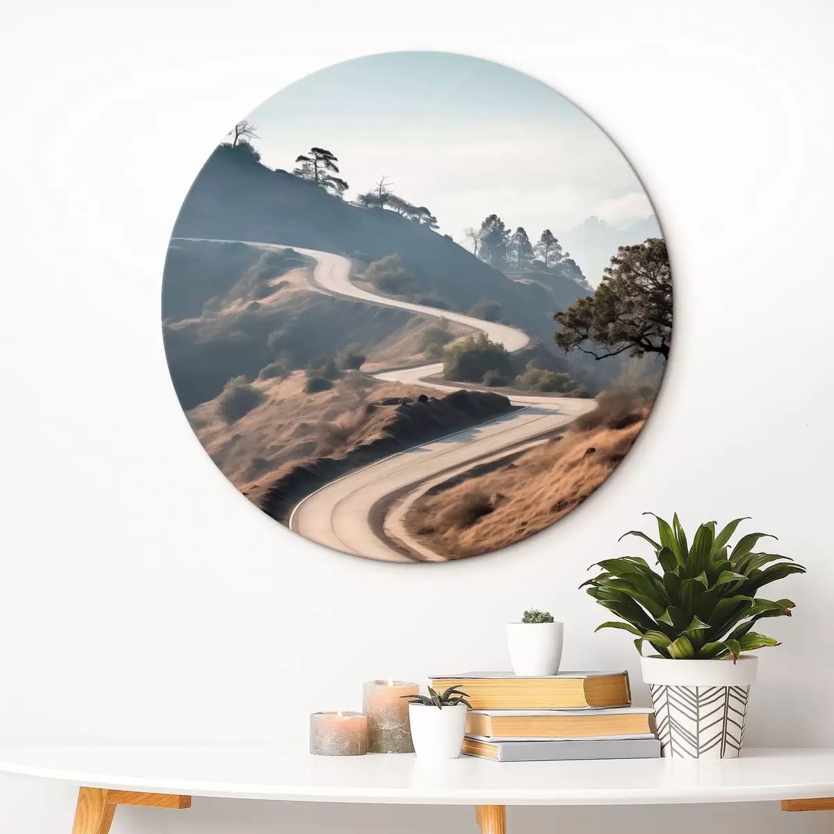 Quadri rotondi Una strada tortuosa che attraversa un paesaggio collinare con erba secca sotto un cielo limpido e montagne in lontananza r46289