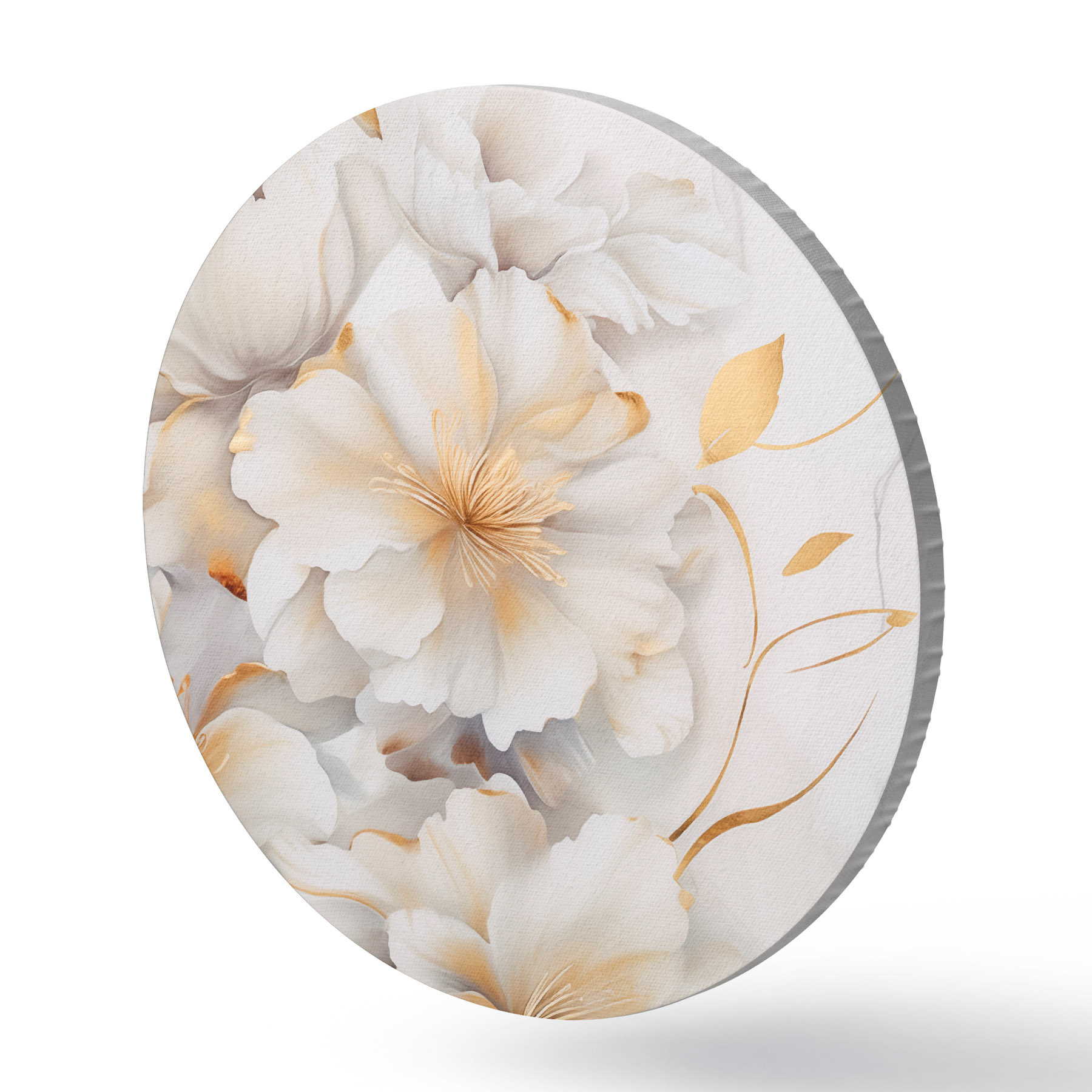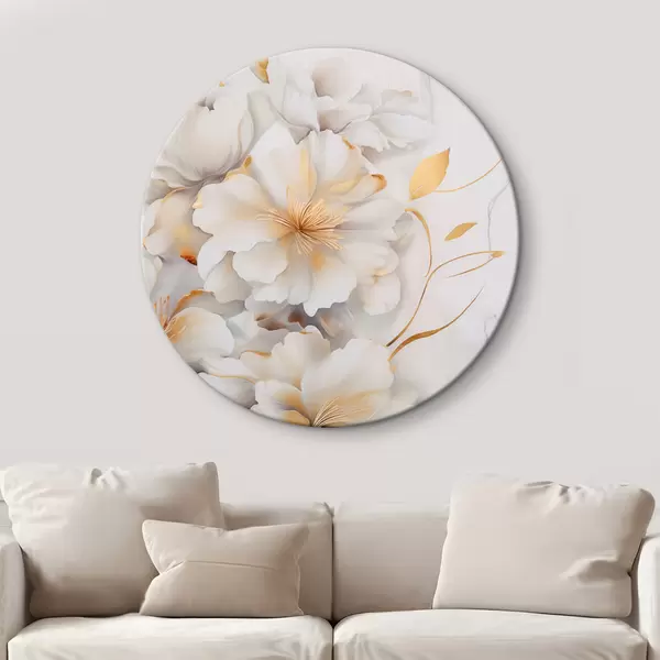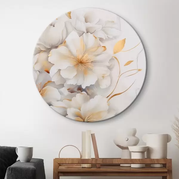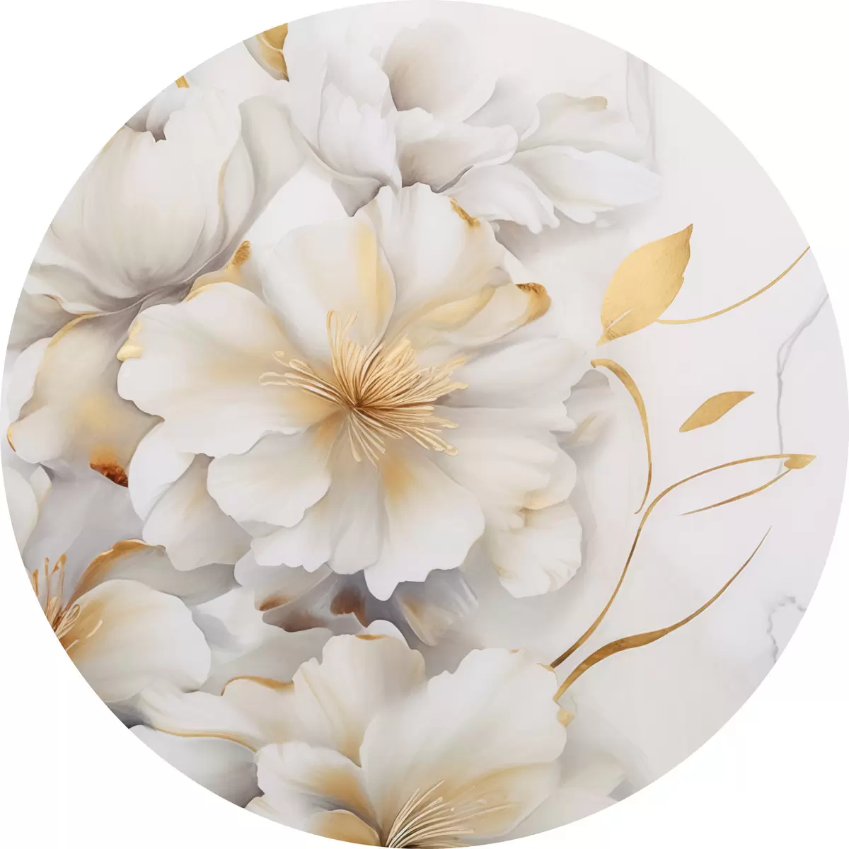 Quadri rotondi Fiori bianchi con dettagli gialli, petali con sfumature delicate, sfondo chiaro con sottile effetto marmorizzato r46292