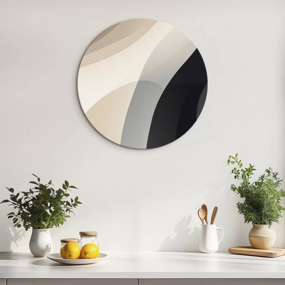 Quadri rotondi Forme organiche ondulate nei toni caldi del beige e del grigio antracite r46494