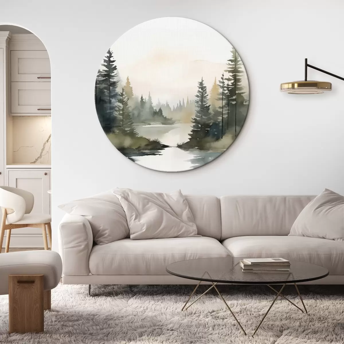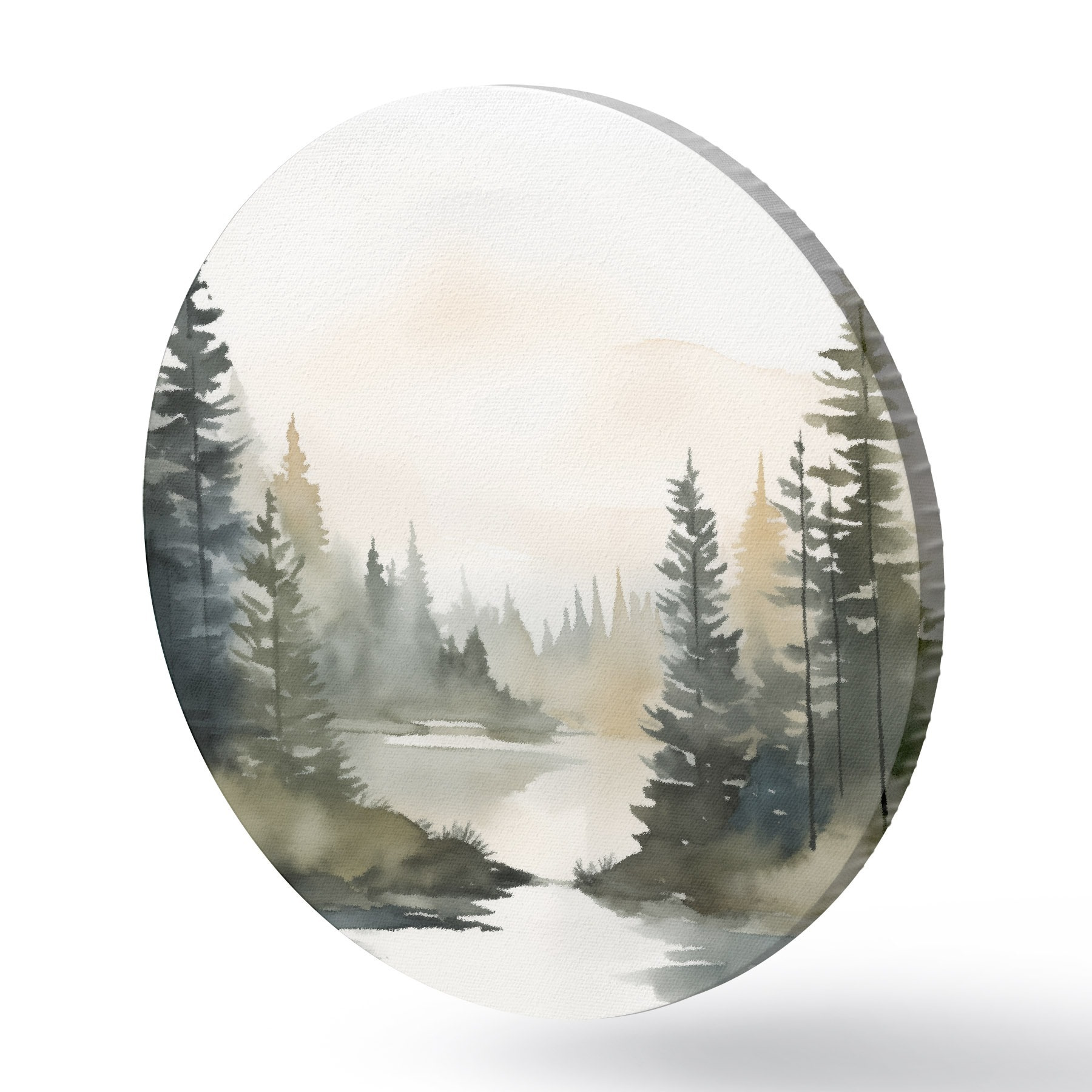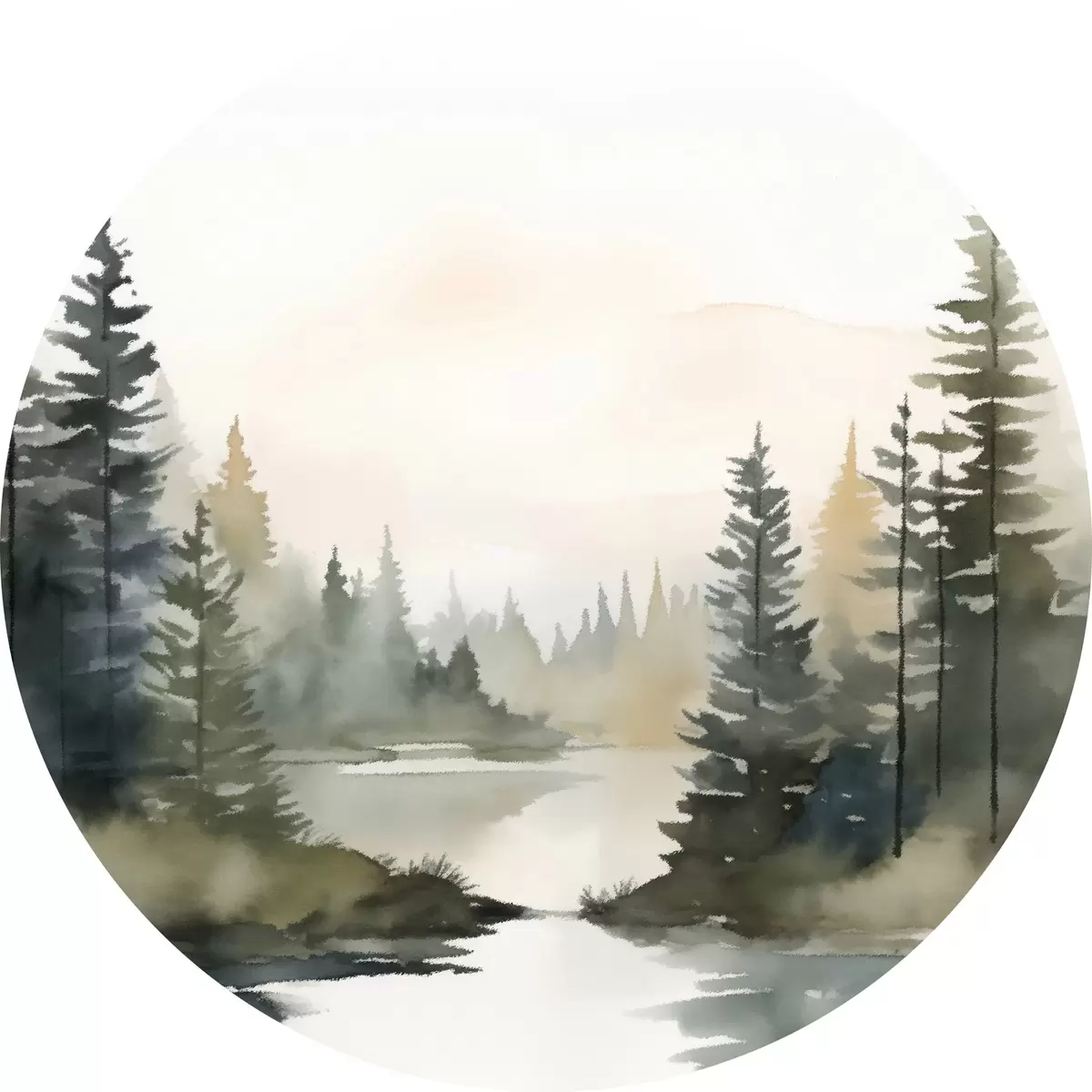 Quadri rotondi Bosco di conifere nebbioso su un fiume tranquillo, stile acquerello r46507