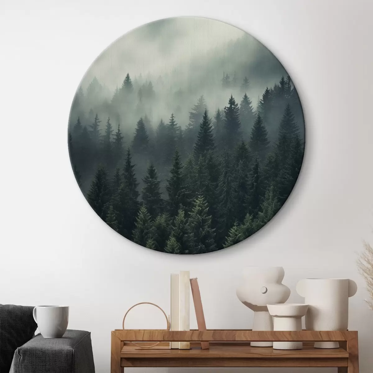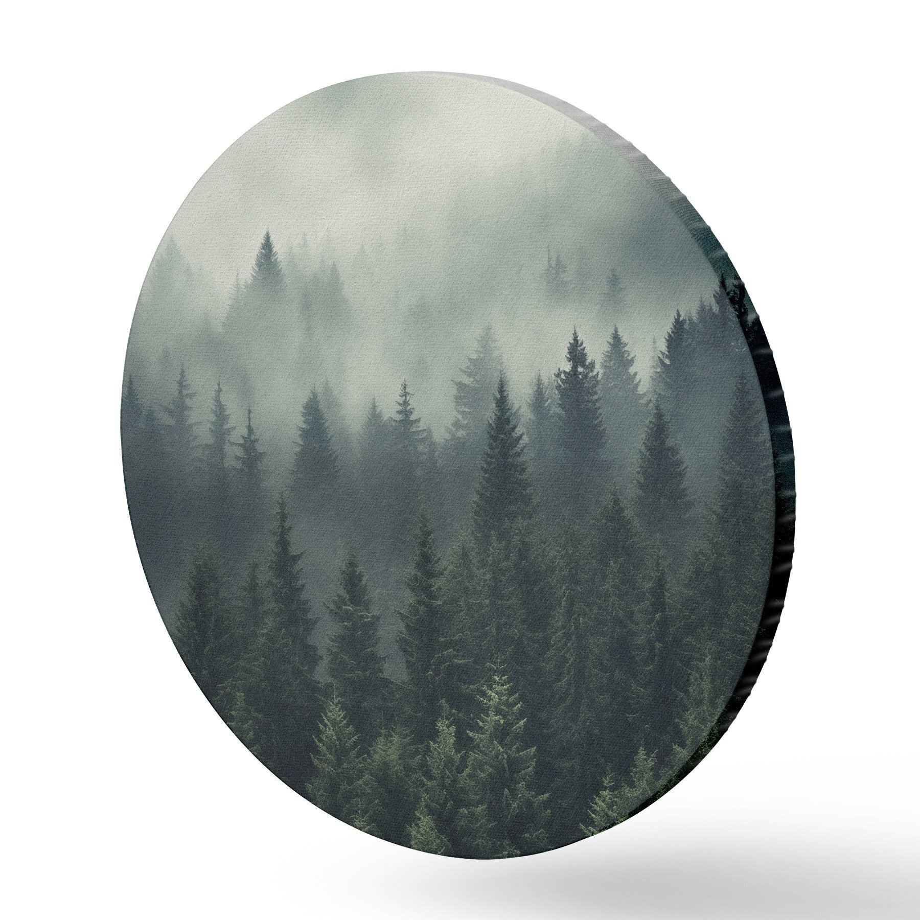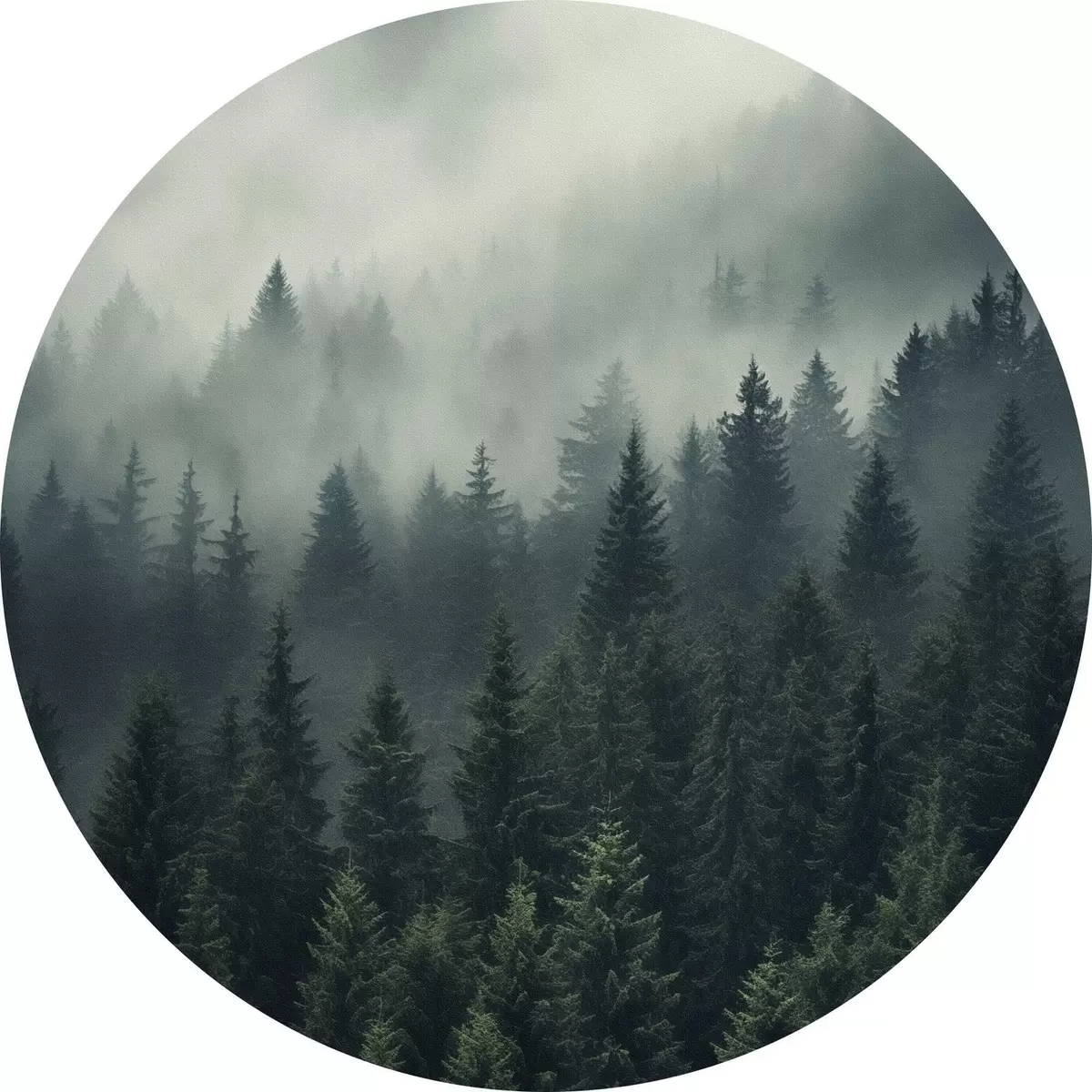 Quadri rotondi Nebbia che avvolge una fitta foresta sempreverde r46512
