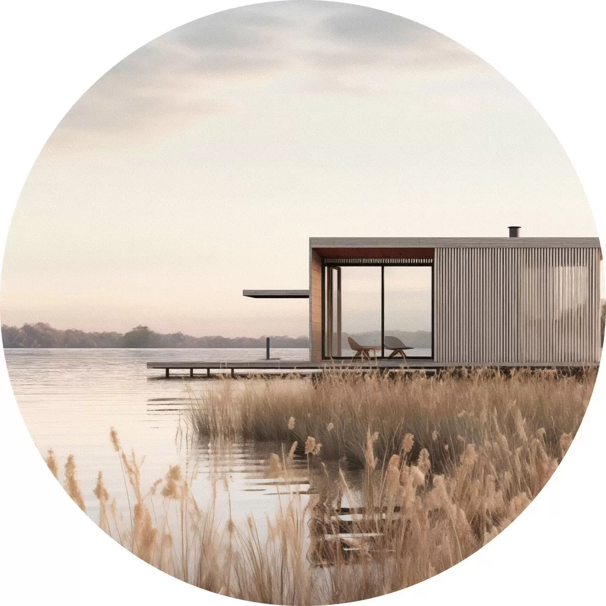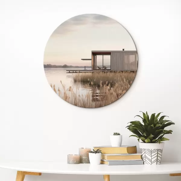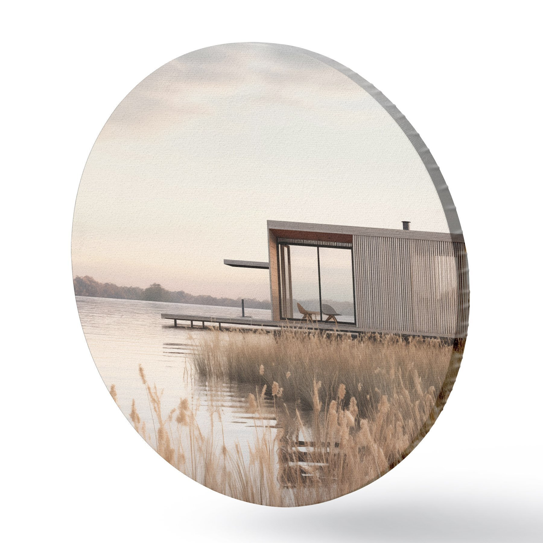 Quadri rotondi Moderna baita sul lago tra i canneti al tramonto r46513