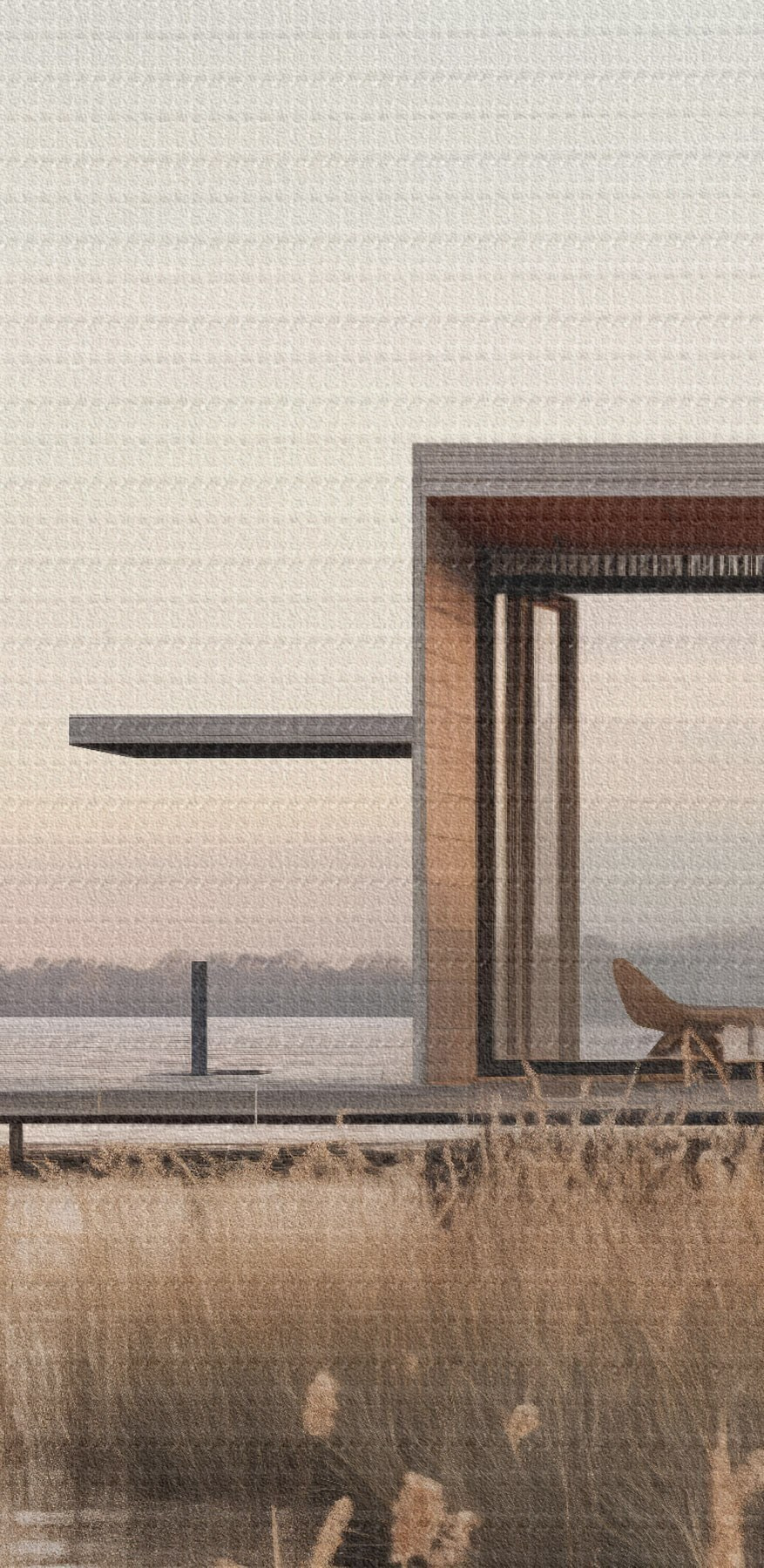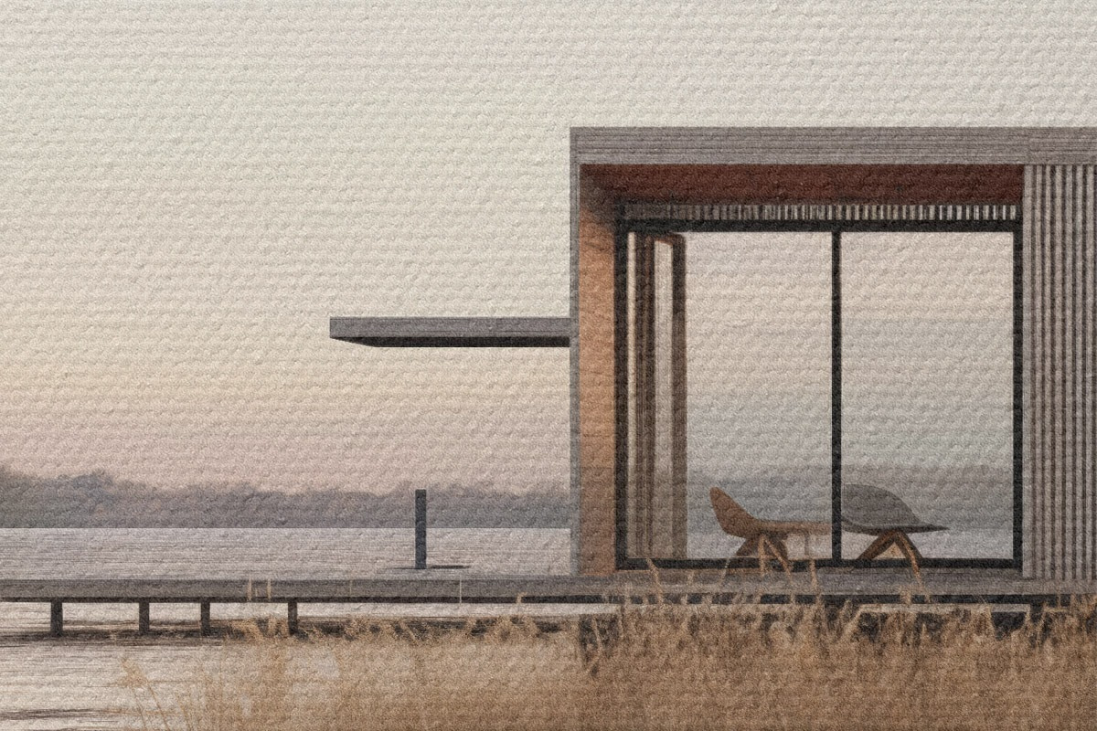 Immagine Moderna baita sul lago tra i canneti al tramonto Nr r46513