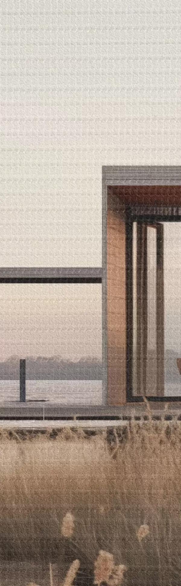 Immagine Moderna baita sul lago tra i canneti al tramonto Nr r46513