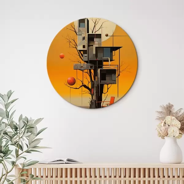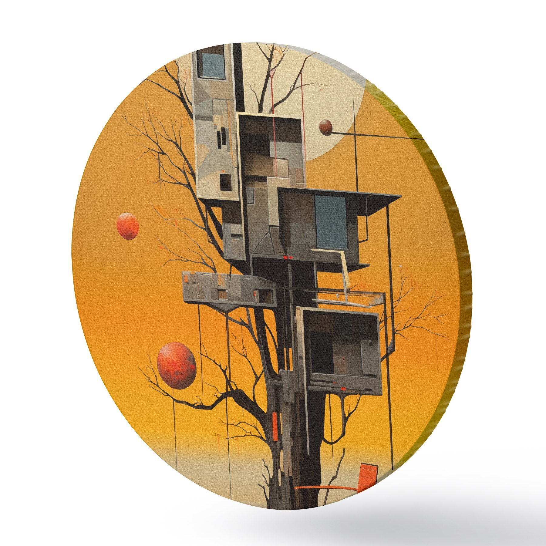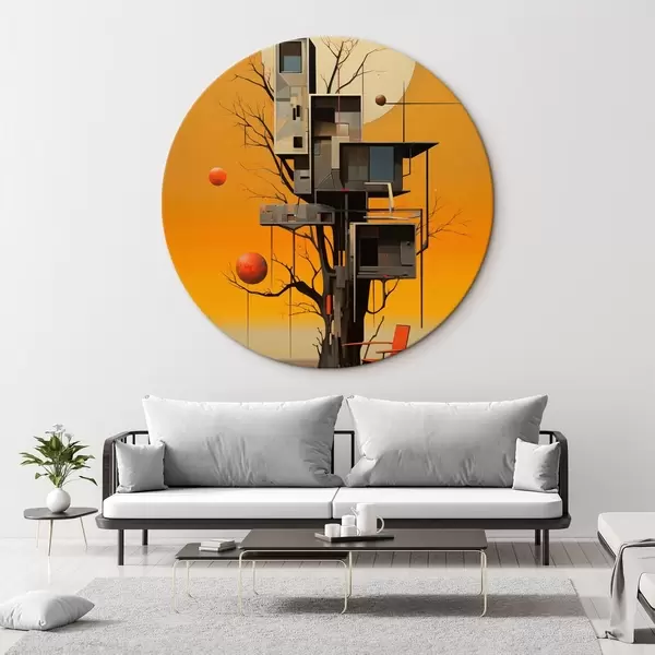Quadri rotondi Surreale casa sull'albero su sfondo arancione r46526