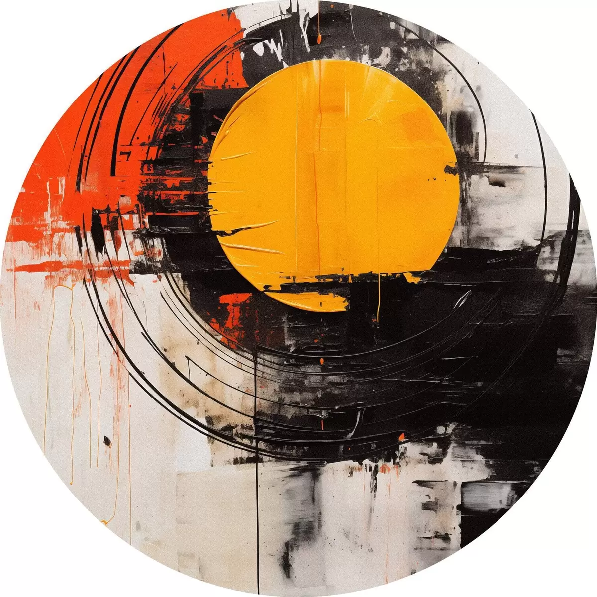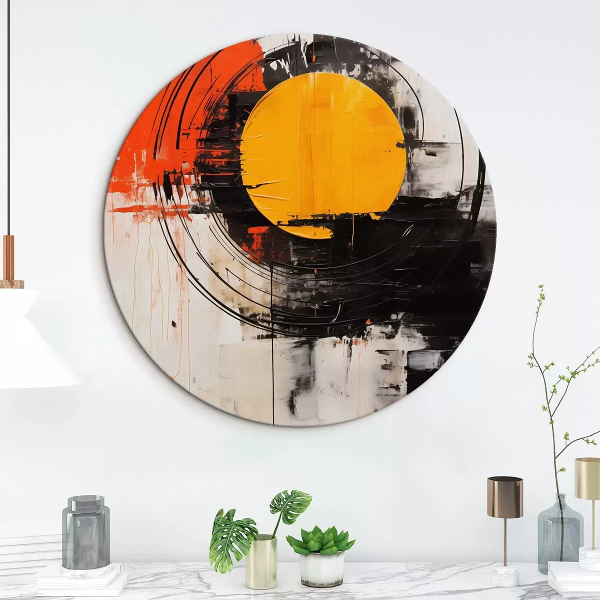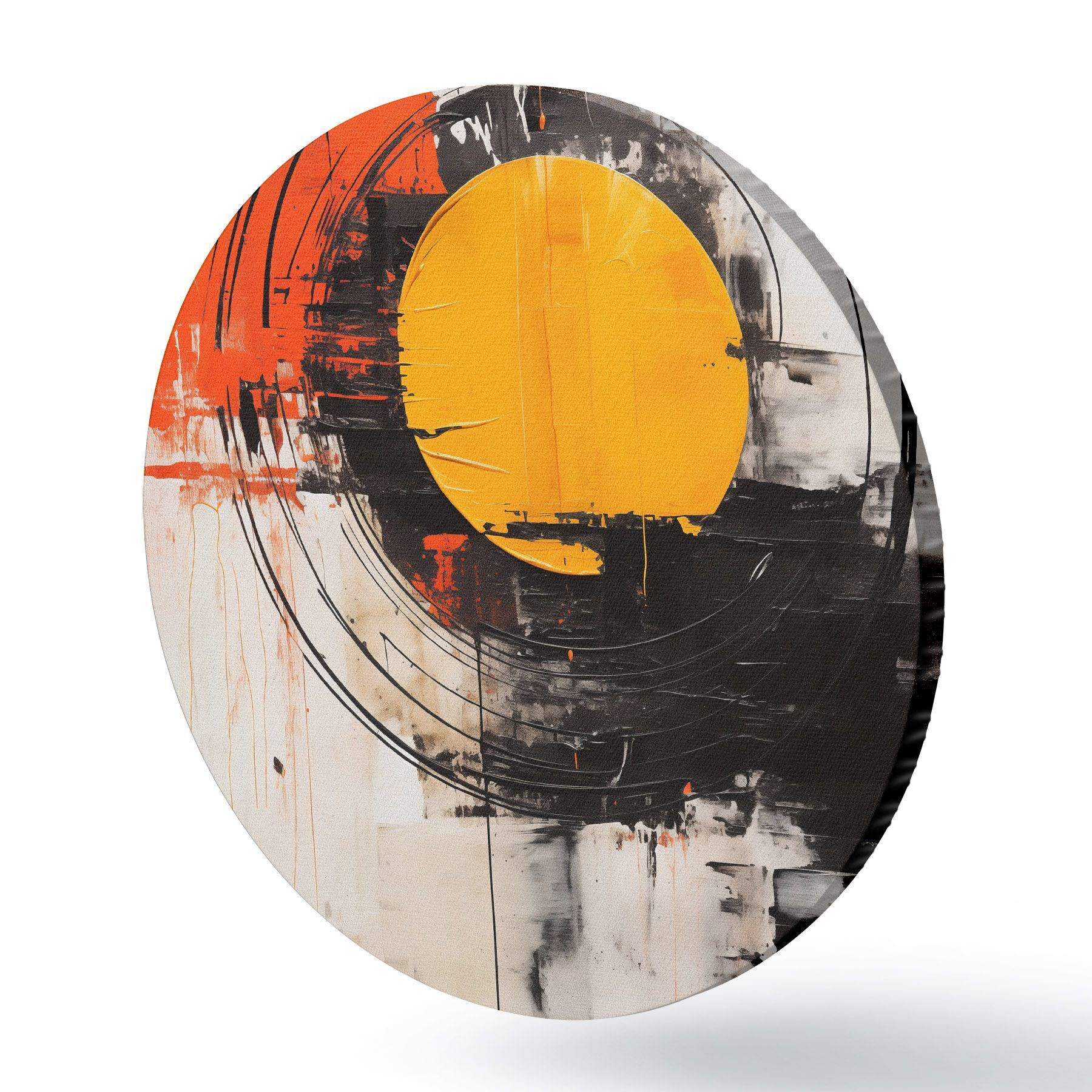Quadri rotondi Disco arancione all'interno di un anello nero, pennellate e schizzi r46550