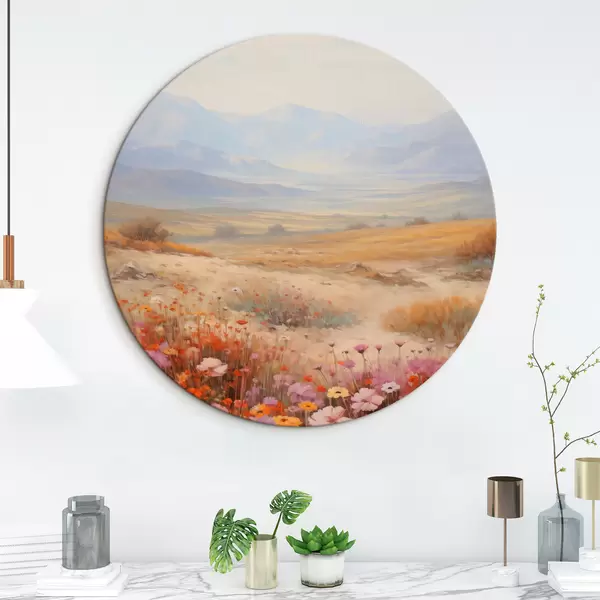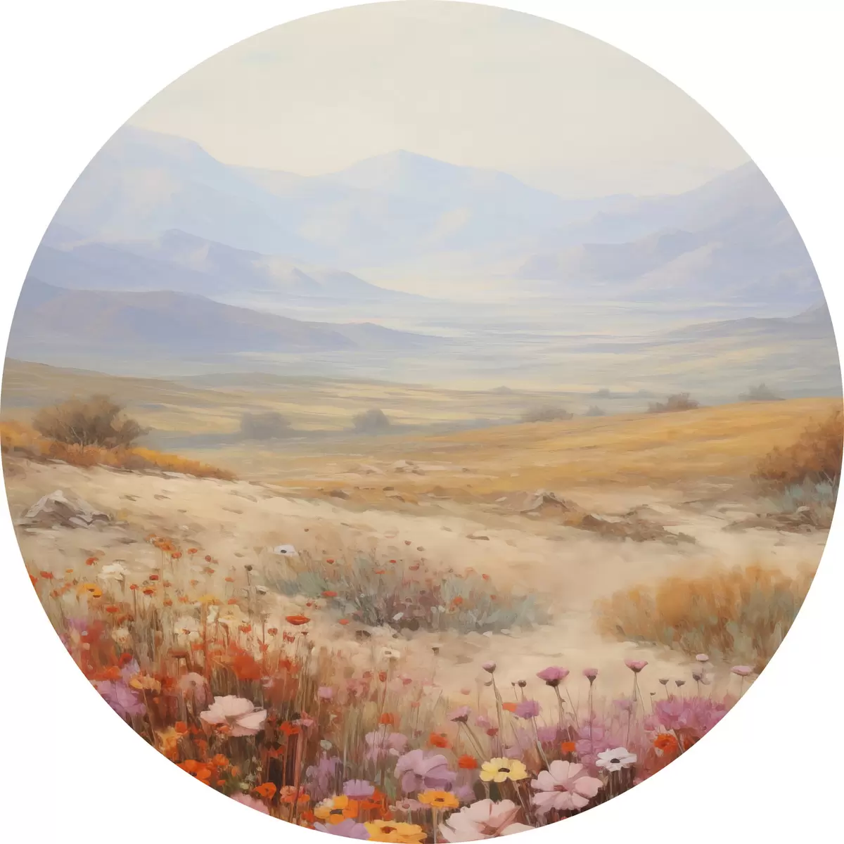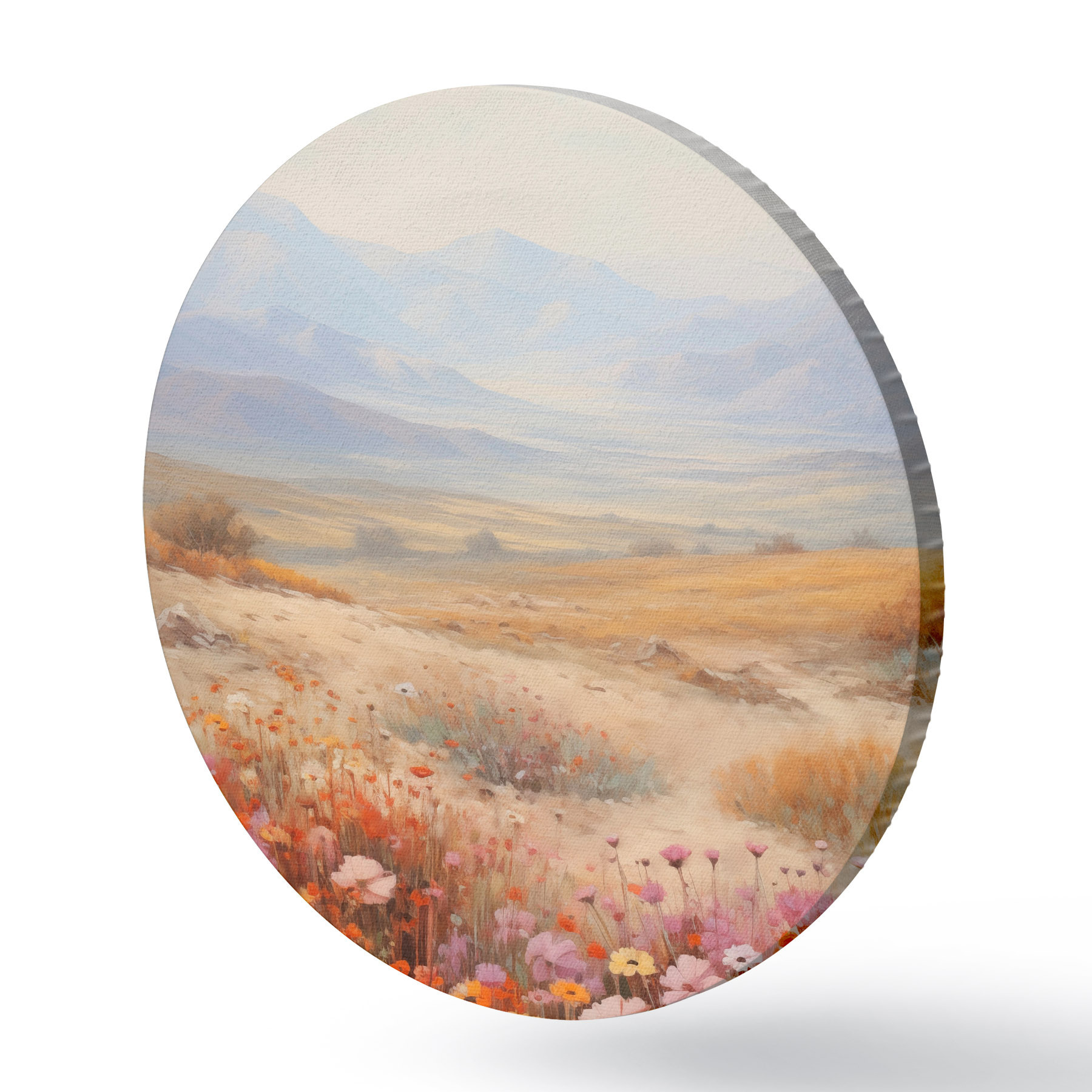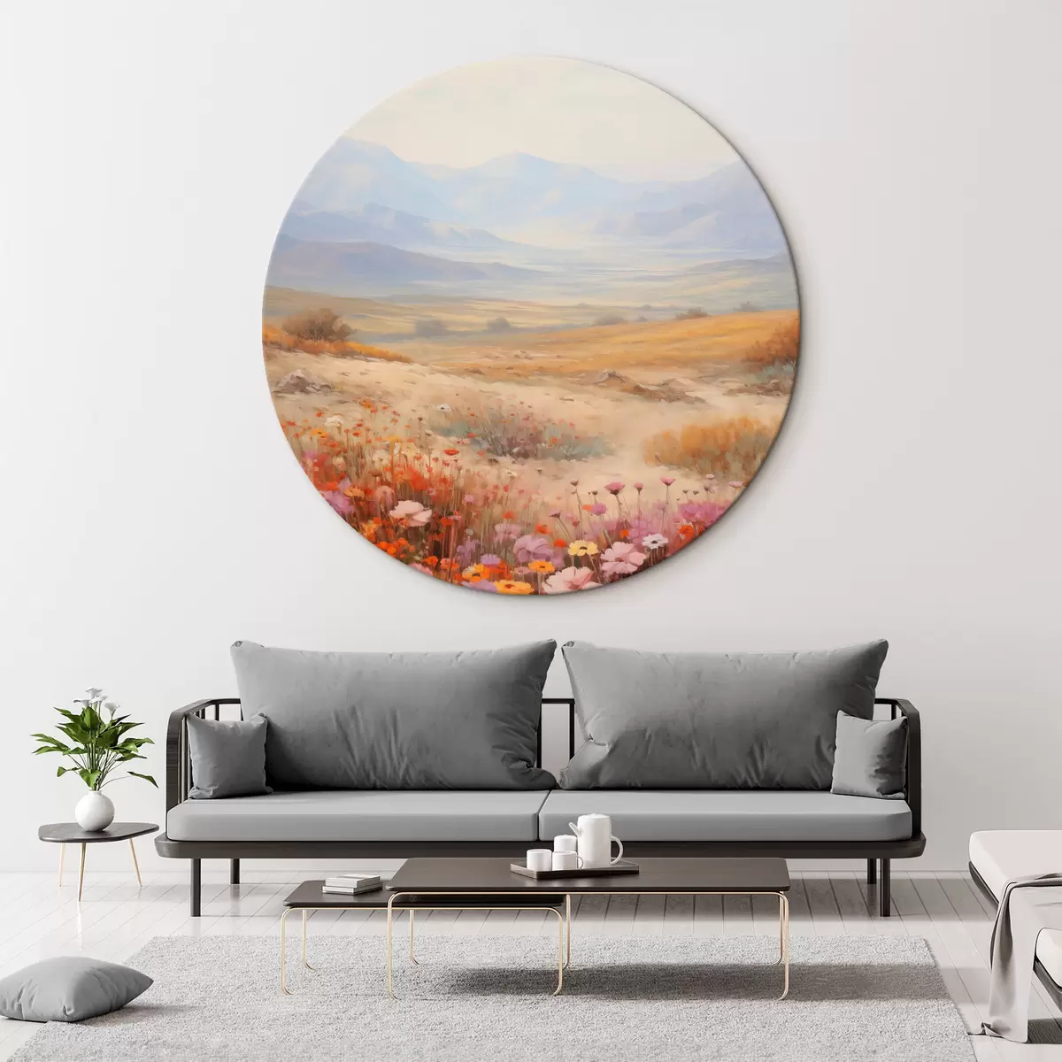 Quadri rotondi Paesaggio, un campo di fiori colorati con le montagne sullo sfondo, colori tenui e pastello r46685