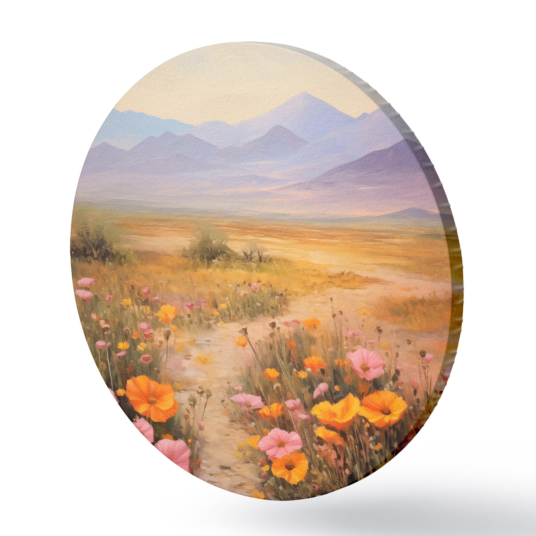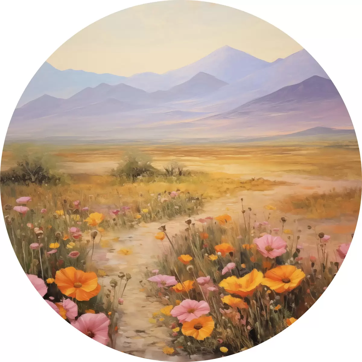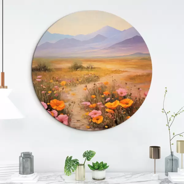 Quadri rotondi Paesaggio, un campo di fiori colorati con le montagne sullo sfondo, colori tenui e pastello r46686