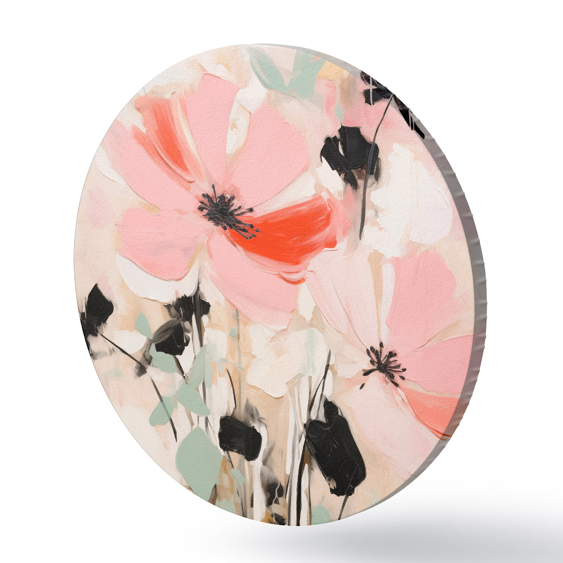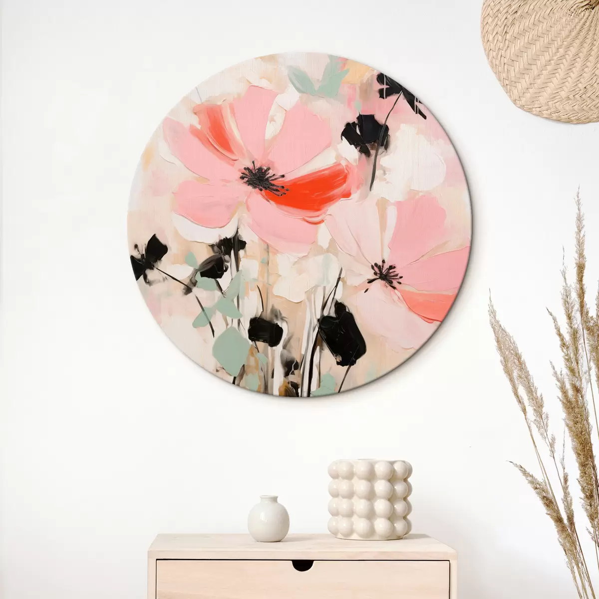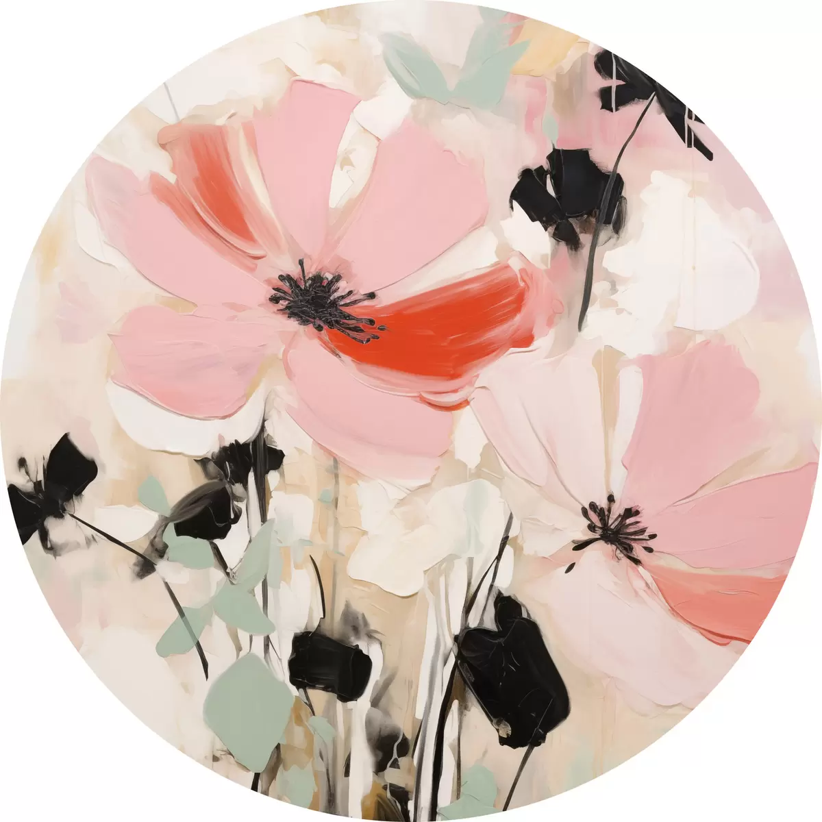 Quadri rotondi Fiori rosa e neri con foglie, colori pastello tenui, composizione floreale astratta, arte minimalista r46687