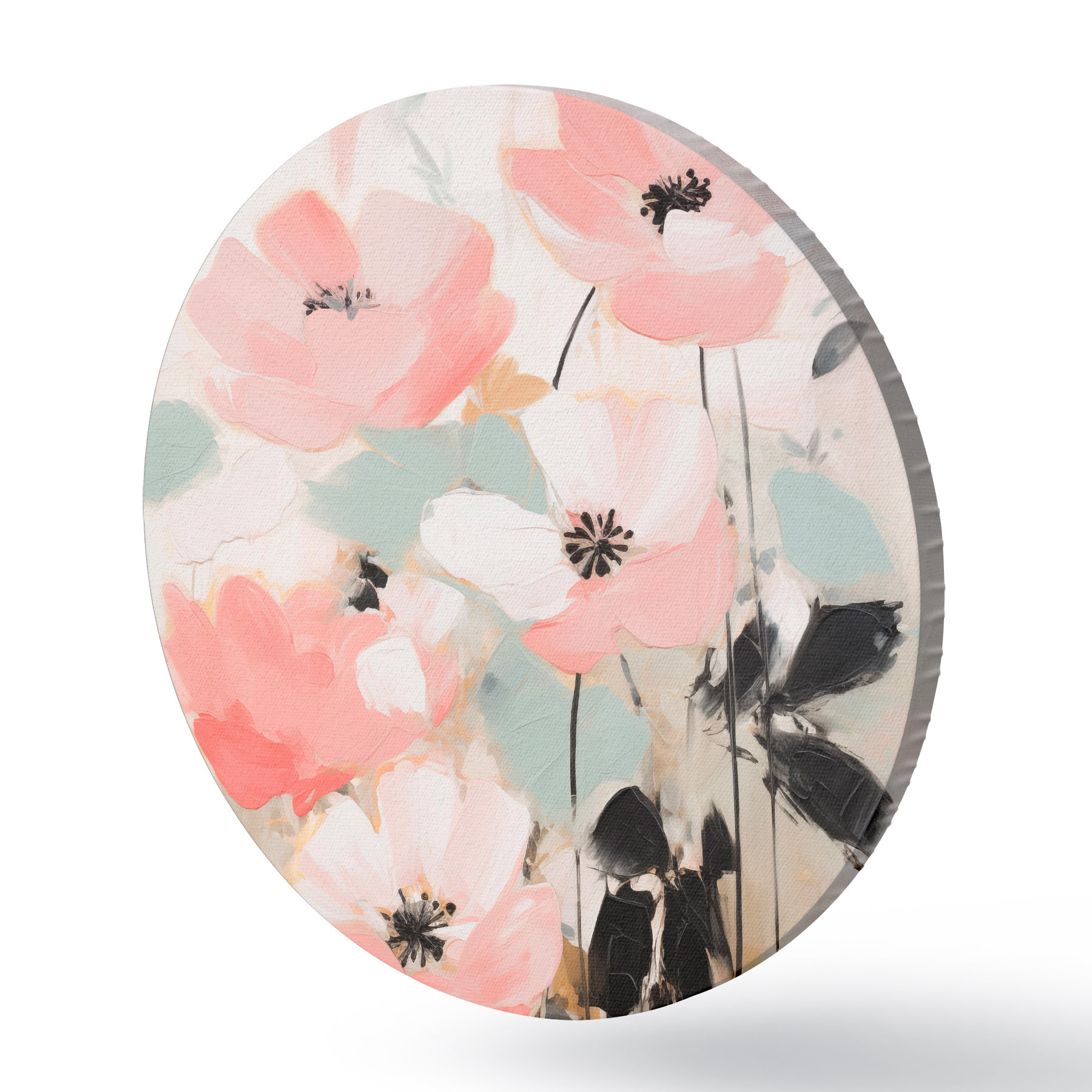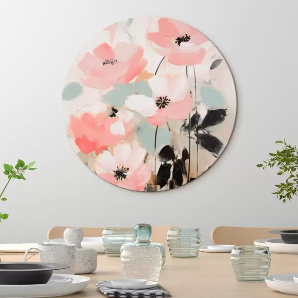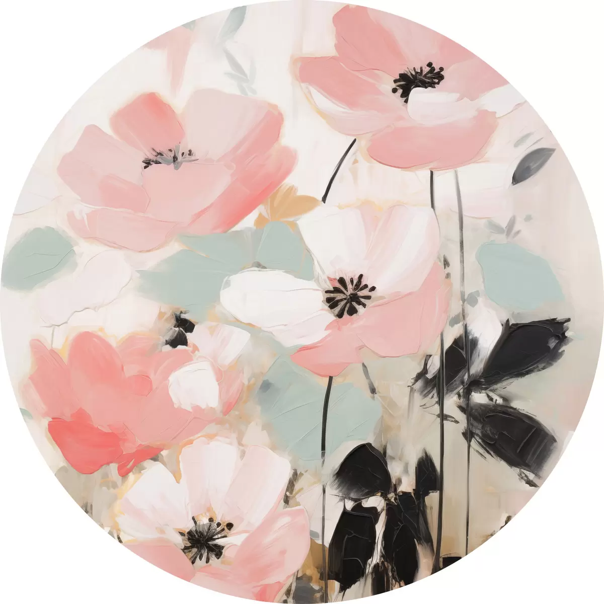 Quadri rotondi Fiori rosa e neri con foglie, colori pastello tenui, composizione floreale astratta, arte minimalista r46688
