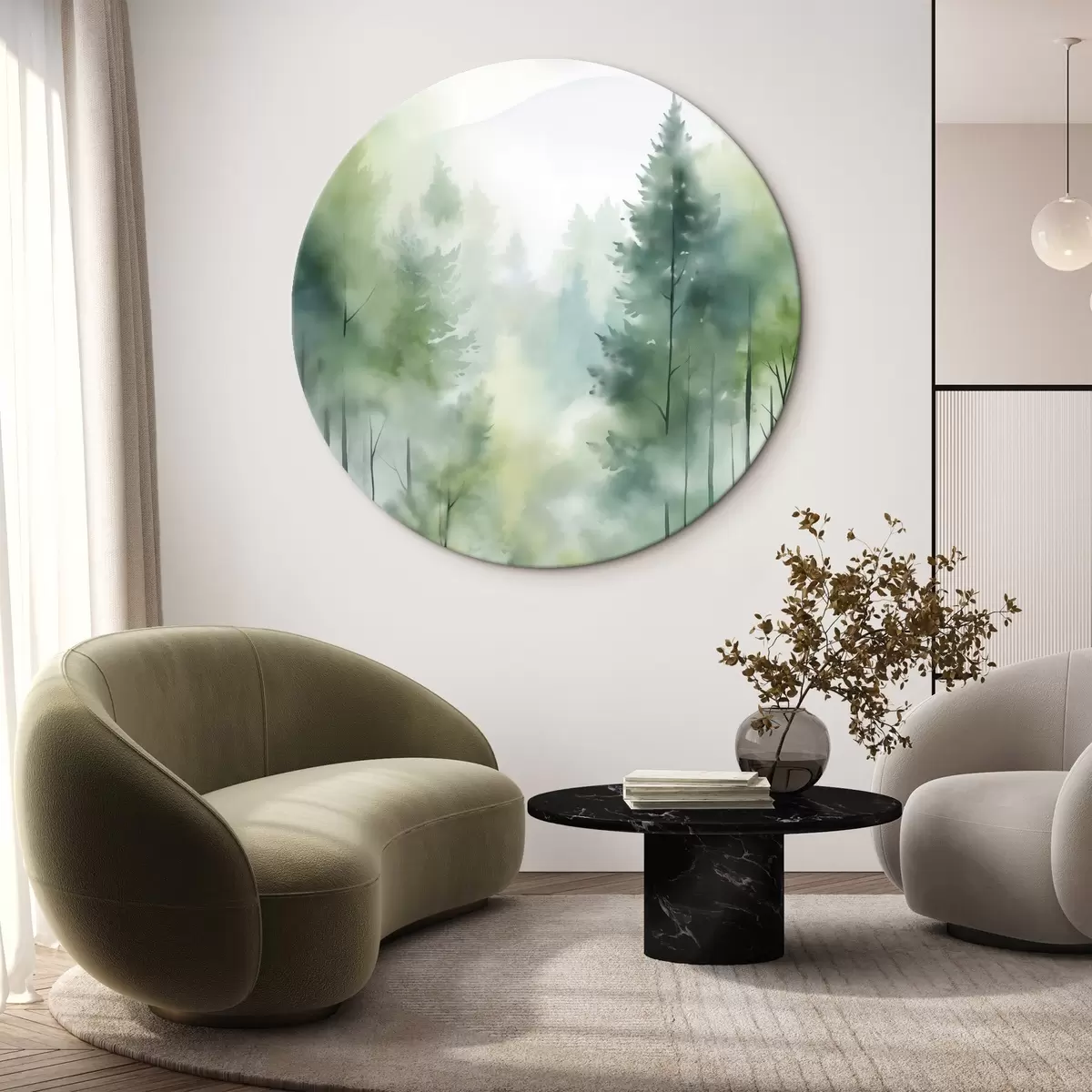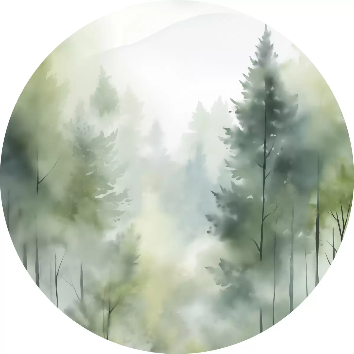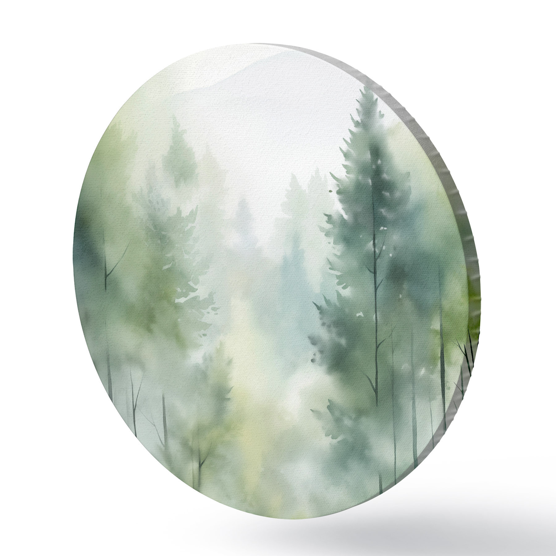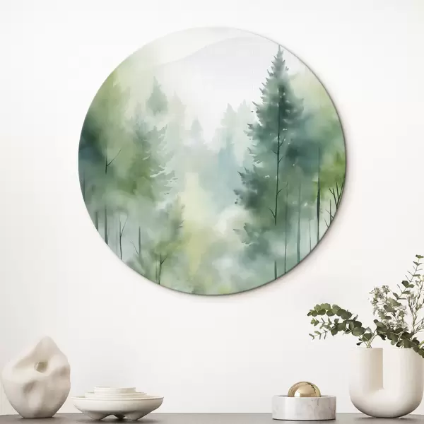Quadri rotondi Imitazione di un dipinto ad acquerello raffigurante una foresta nebbiosa con alti pini e montagne sullo sfondo r46690
