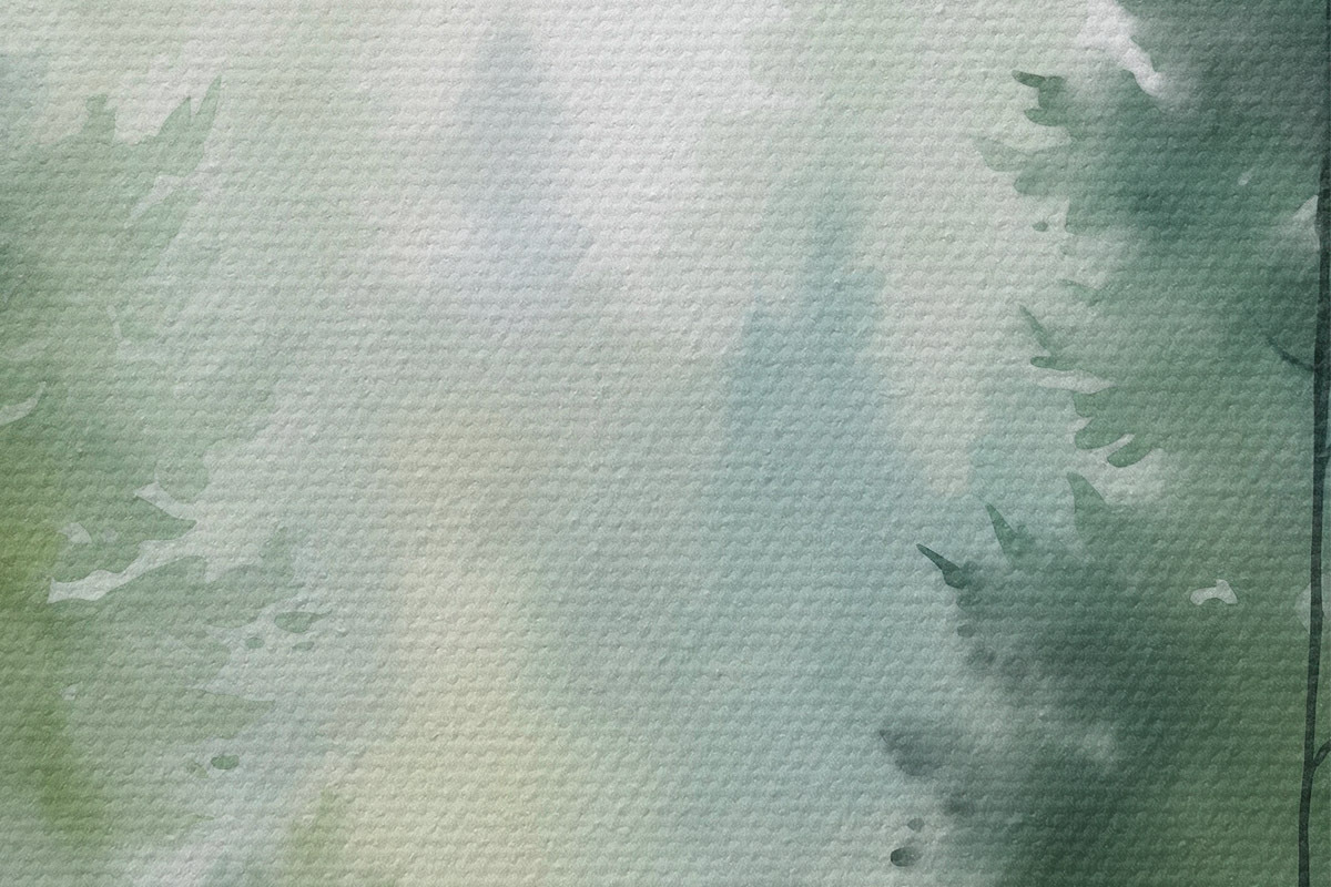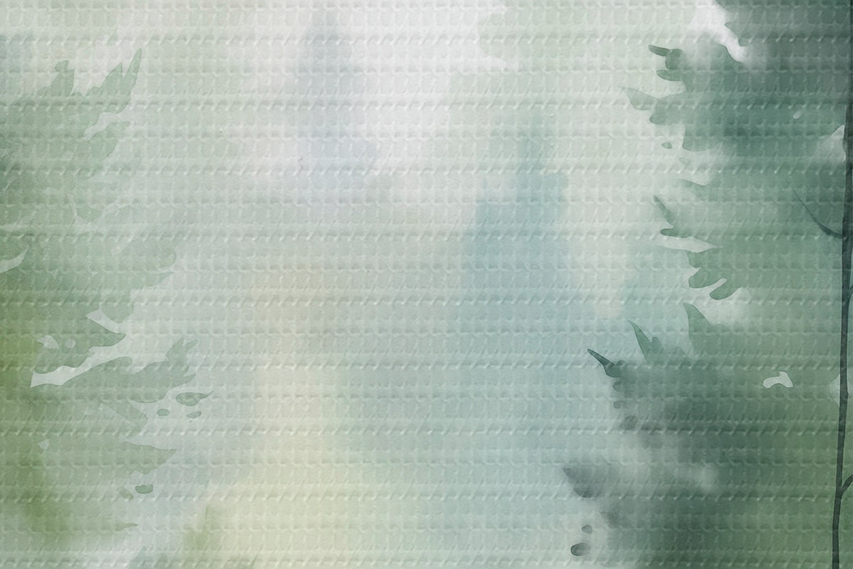 Immagine Imitazione di un dipinto ad acquerello raffigurante una foresta nebbiosa con alti pini e montagne sullo sfondo Nr r46690