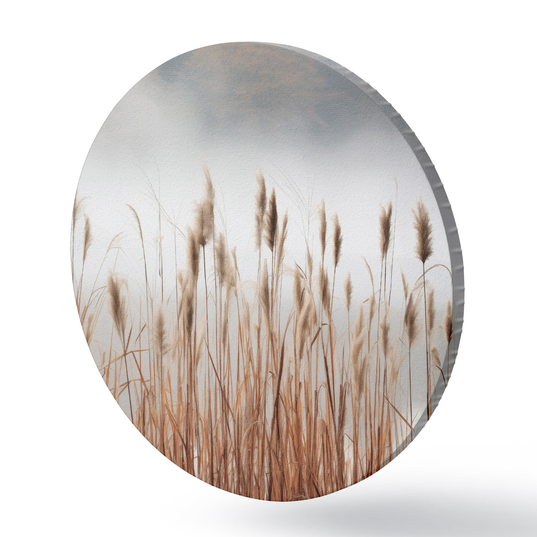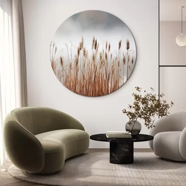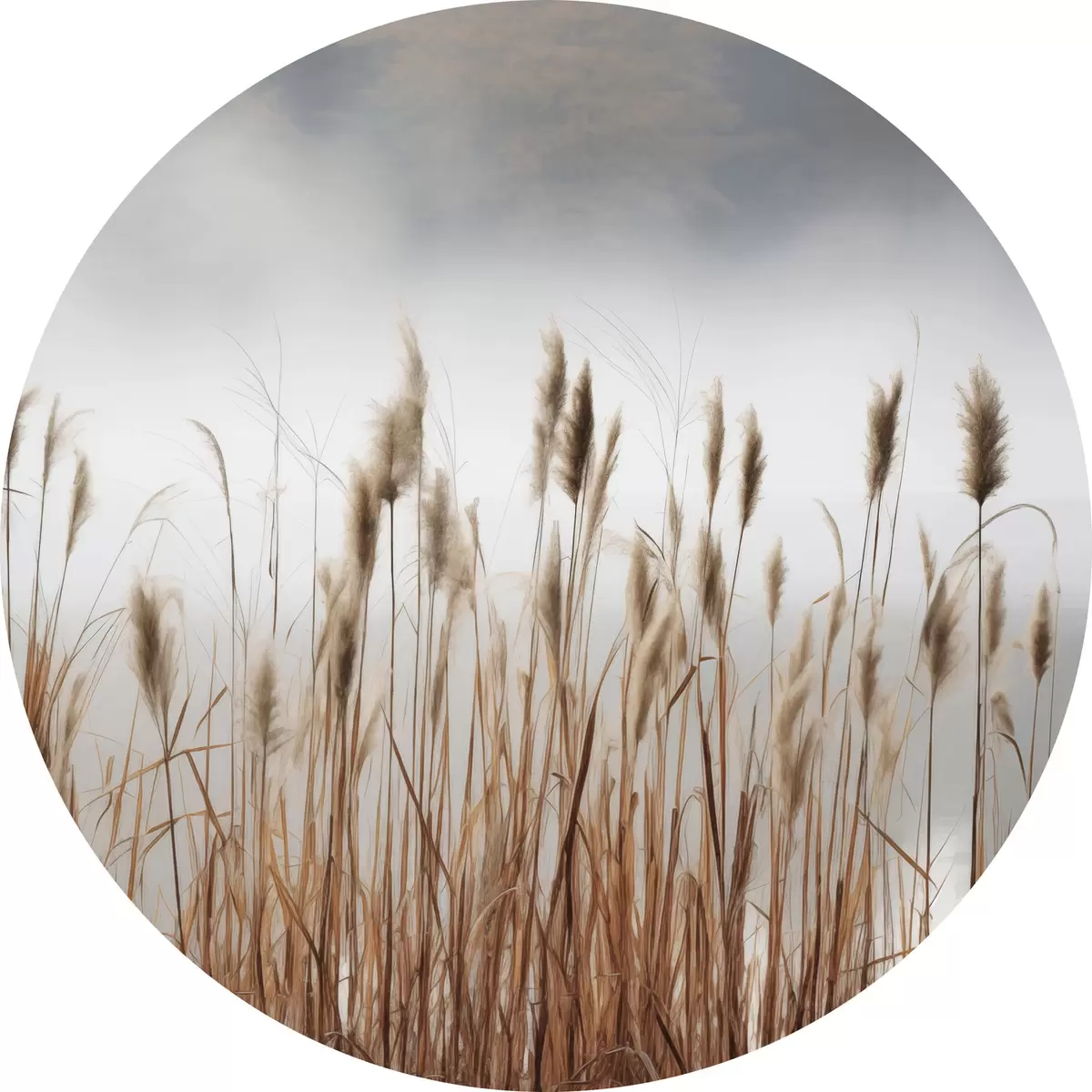 Quadri rotondi Alte canne che crescono in uno specchio d'acqua, l'acqua riflette le canne, sfondo nebbioso, luce soffusa, scena naturale r46696