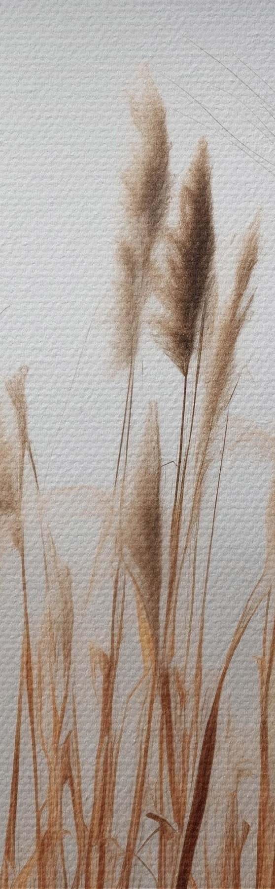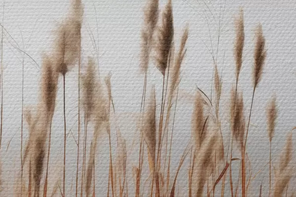 Immagine Alte canne che crescono in uno specchio d'acqua, l'acqua riflette le canne, sfondo nebbioso, luce soffusa, scena naturale Nr r46696
