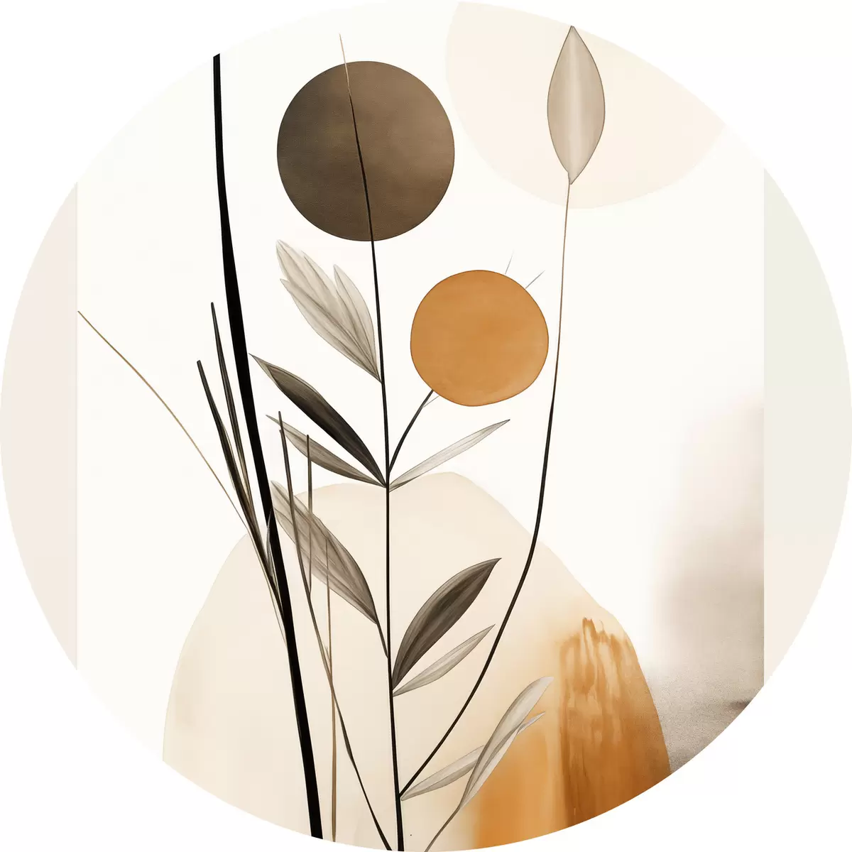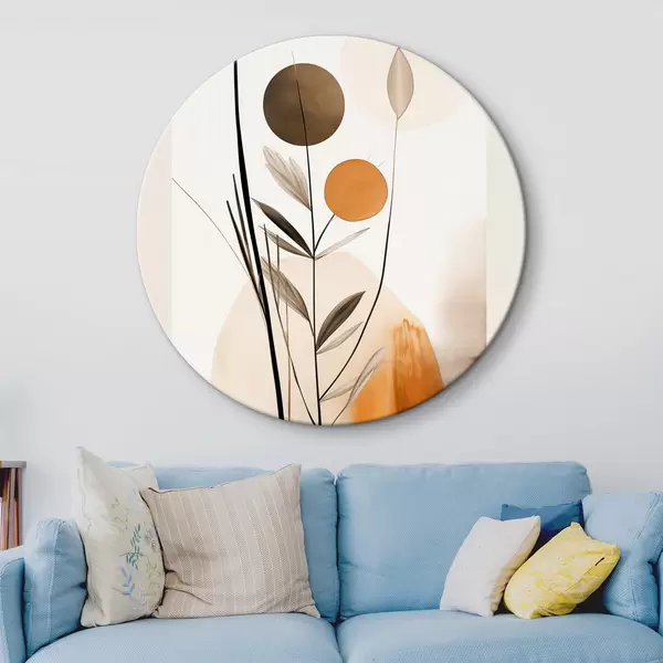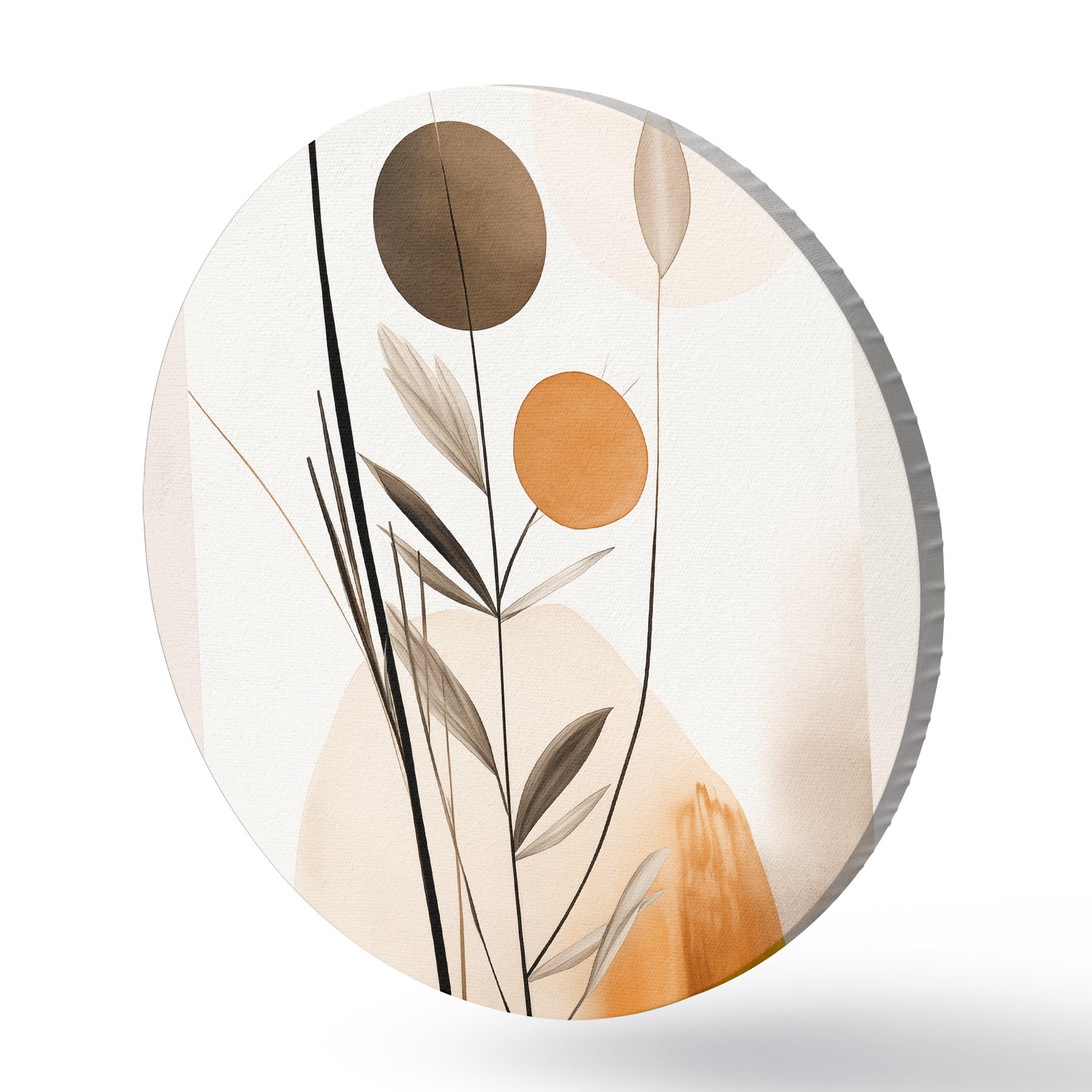Quadri rotondi Imitazione di pittura astratta con cerchi arancioni e grigi, foglie e rami, stile moderno, effetto acquerello r46698