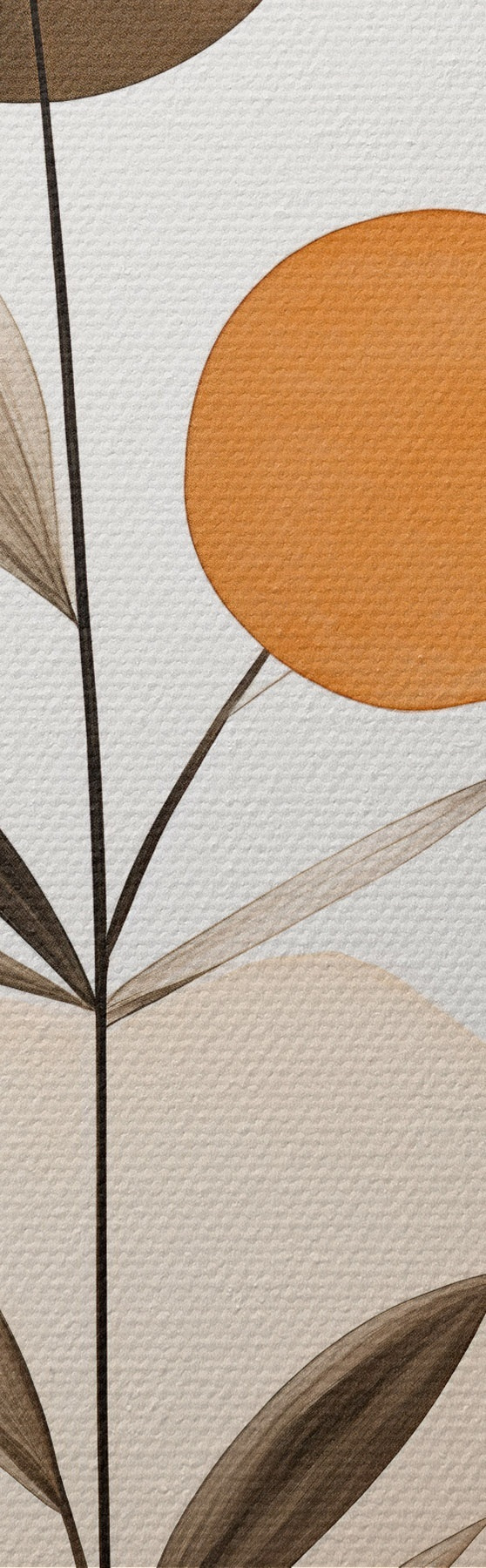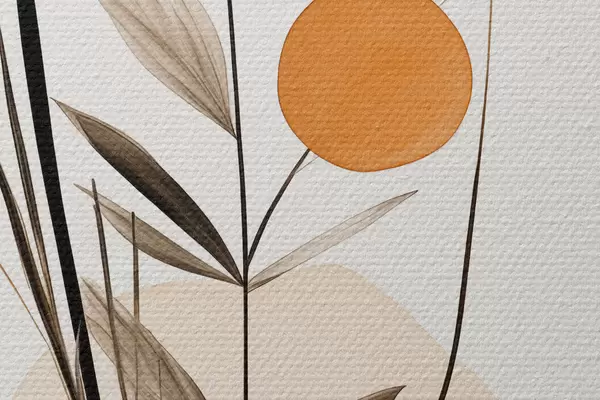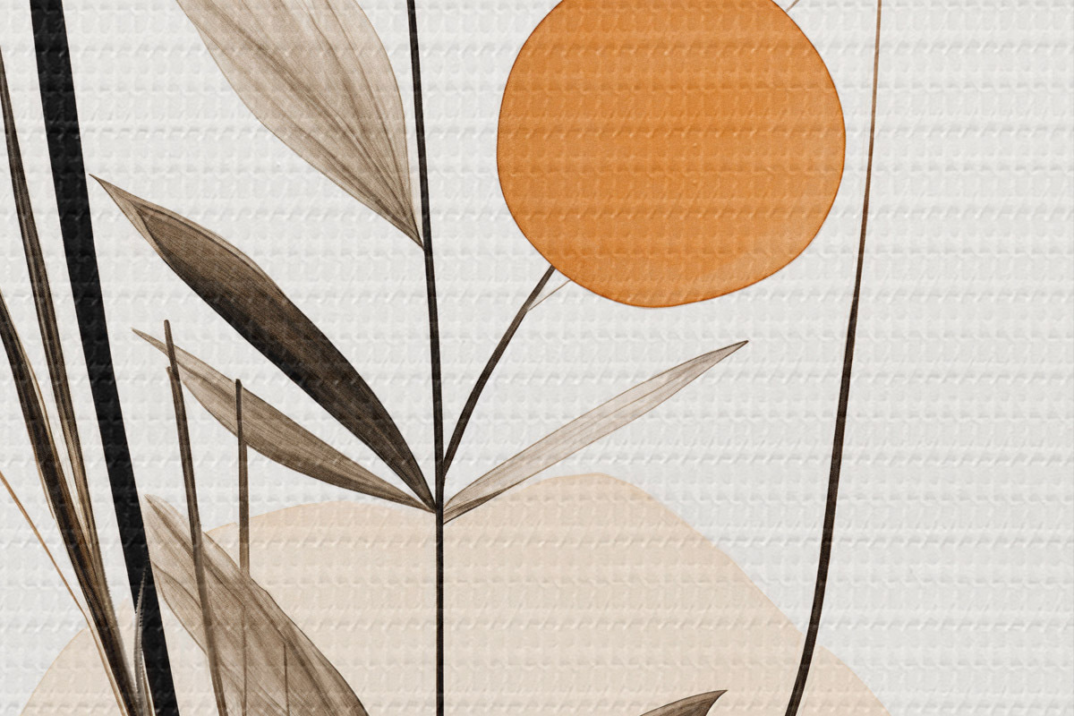 Immagine Imitazione di pittura astratta con cerchi arancioni e grigi, foglie e rami, stile moderno, effetto acquerello Nr r46698