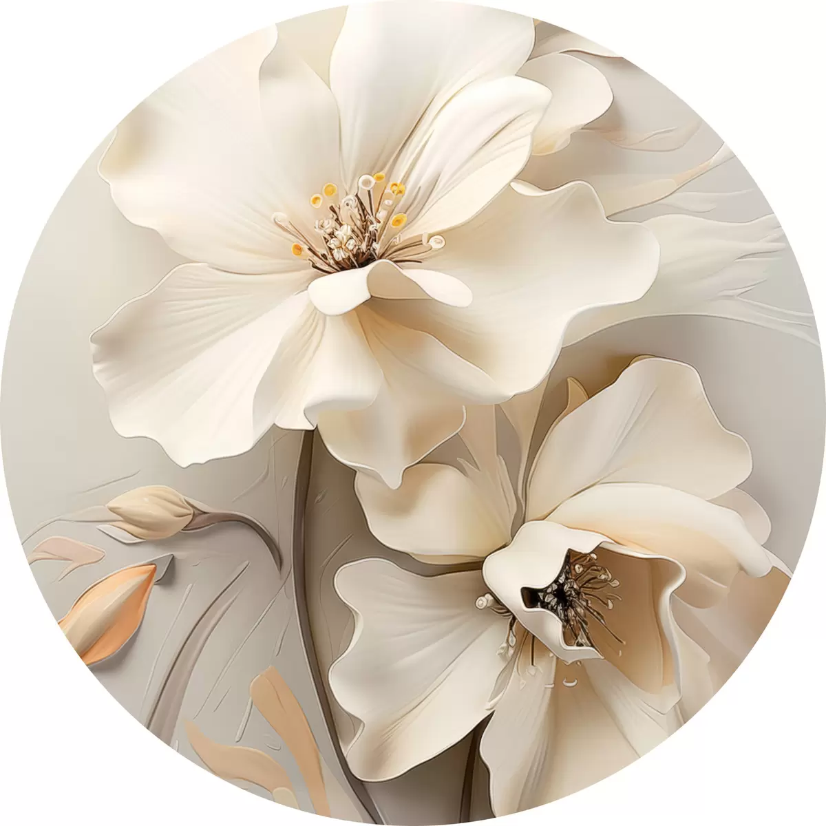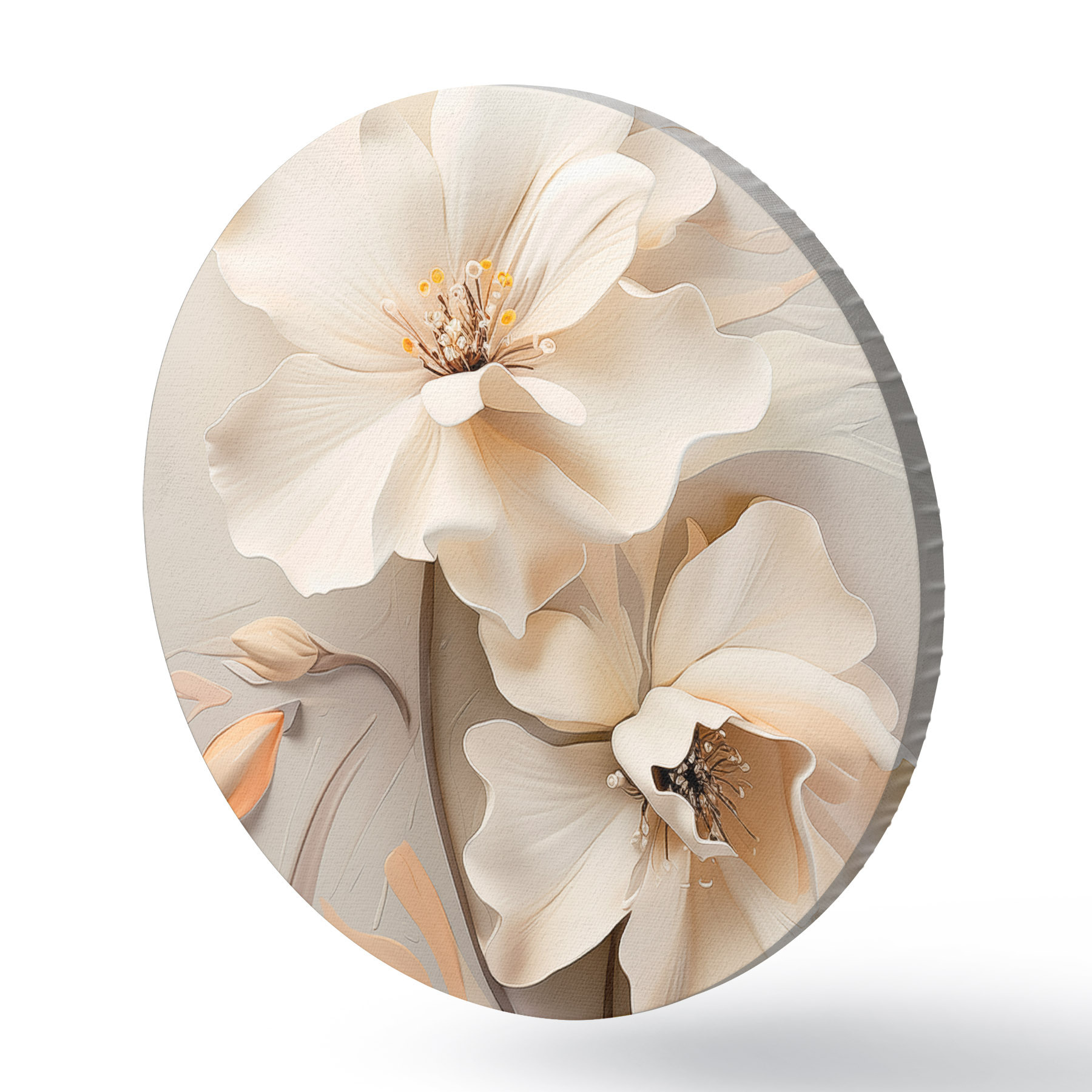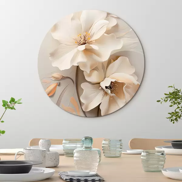 Quadri rotondi Fiori bianchi, petali con ombre delicate, sfondo beige chiaro, composizione elegante, stile minimalista r46700