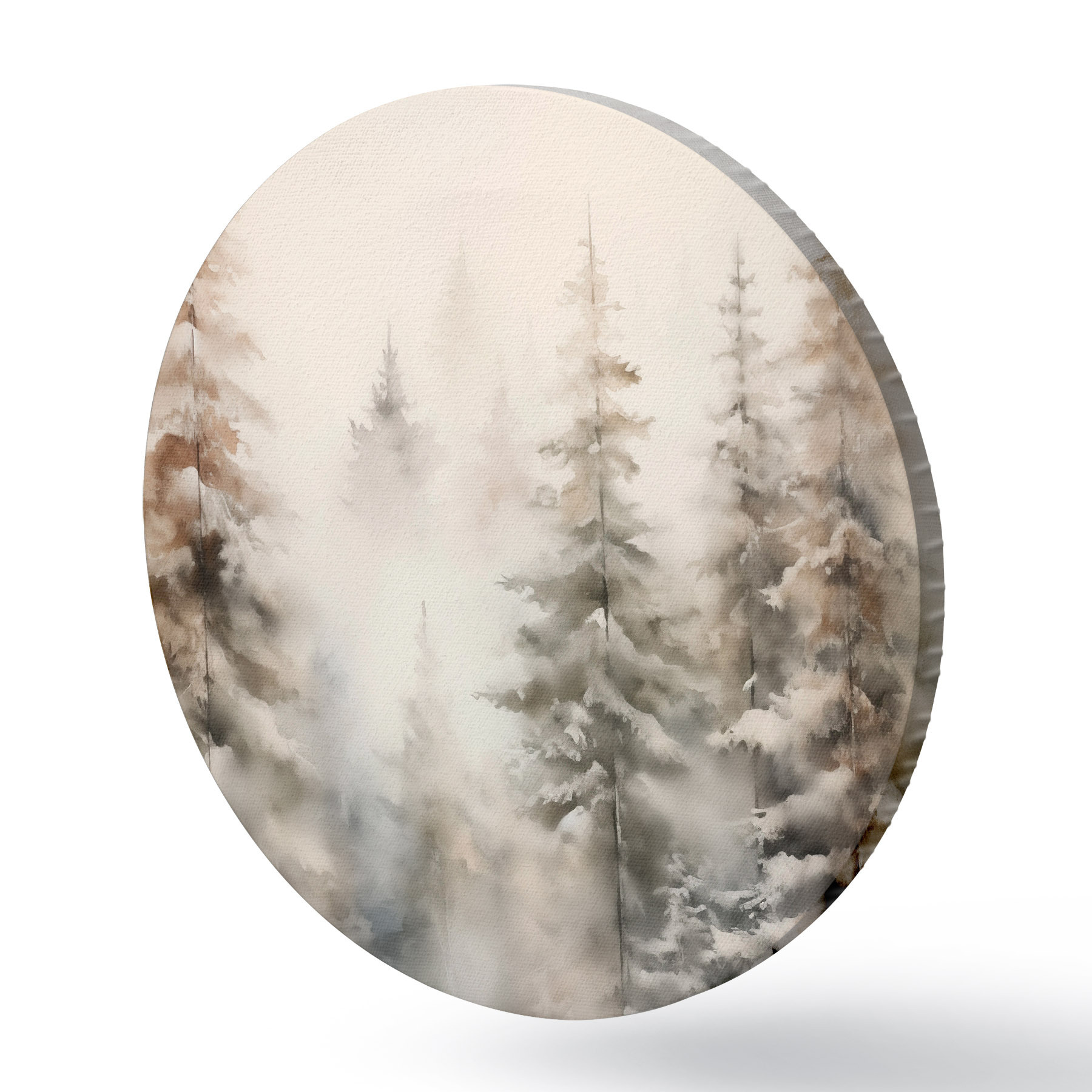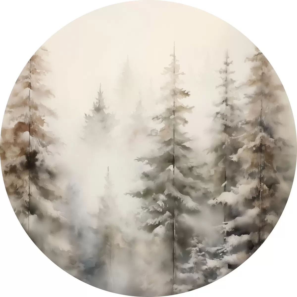Quadri rotondi Alti pini ricoperti di neve, immersi in una foresta avvolta dalla nebbia, una scena invernale morbida e ovattata. r46701