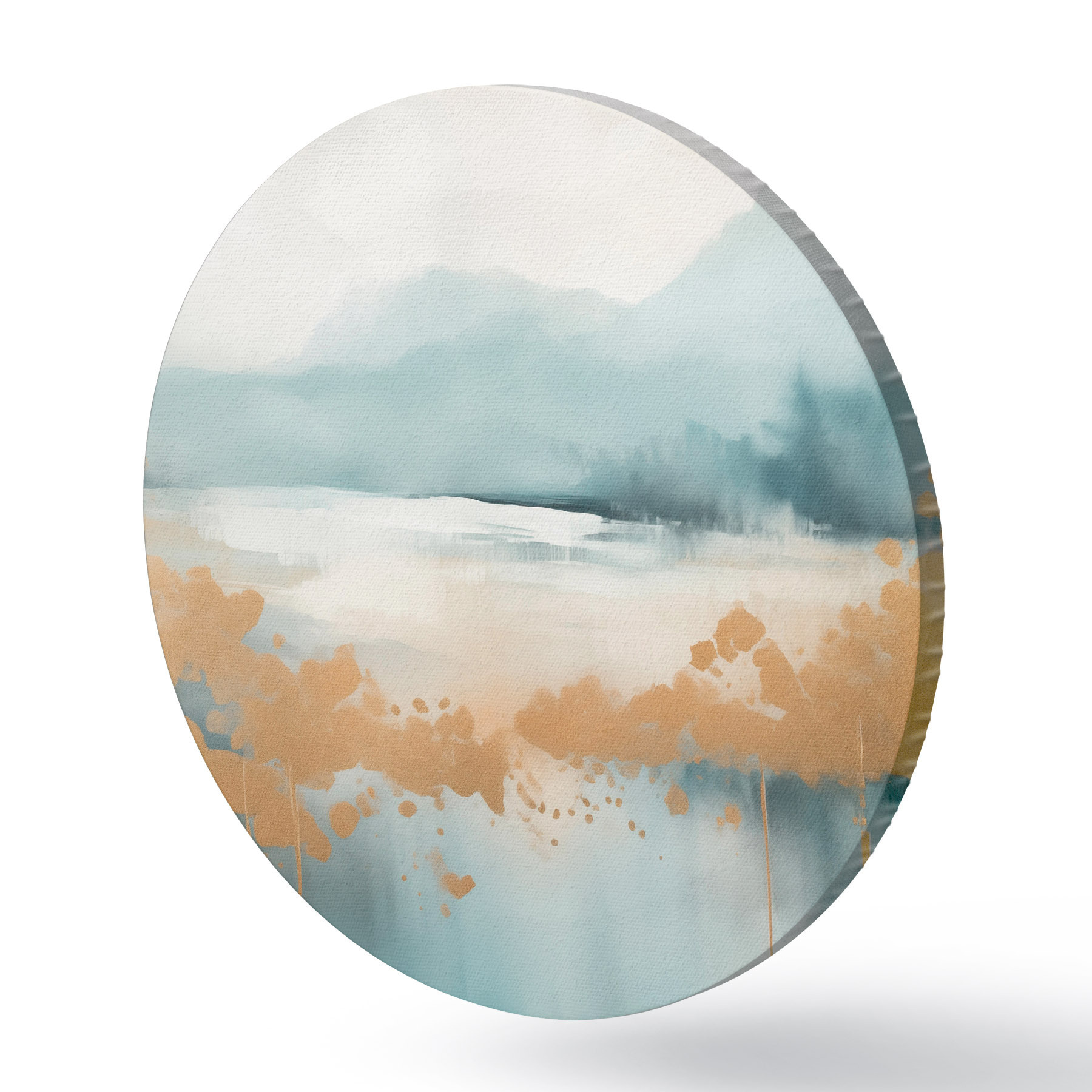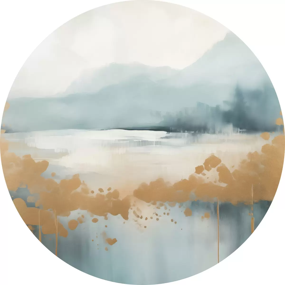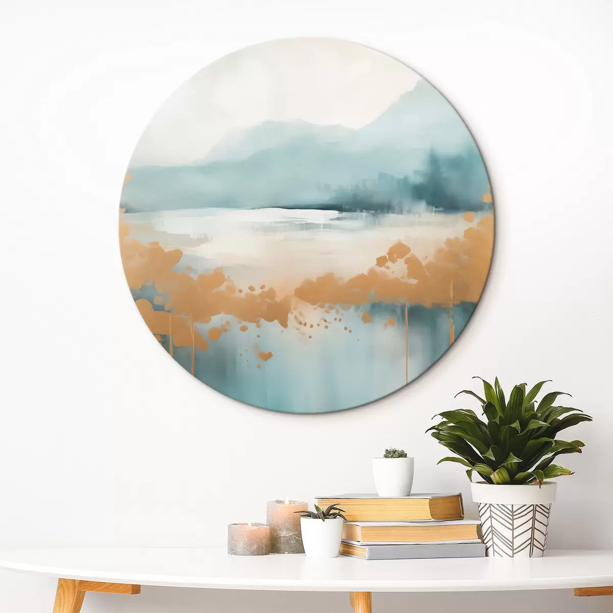 Quadri rotondi Paesaggio astratto con montagne e lago in verde acqua e giallo materico, pennellate morbide, opera d'arte minimalista r46703