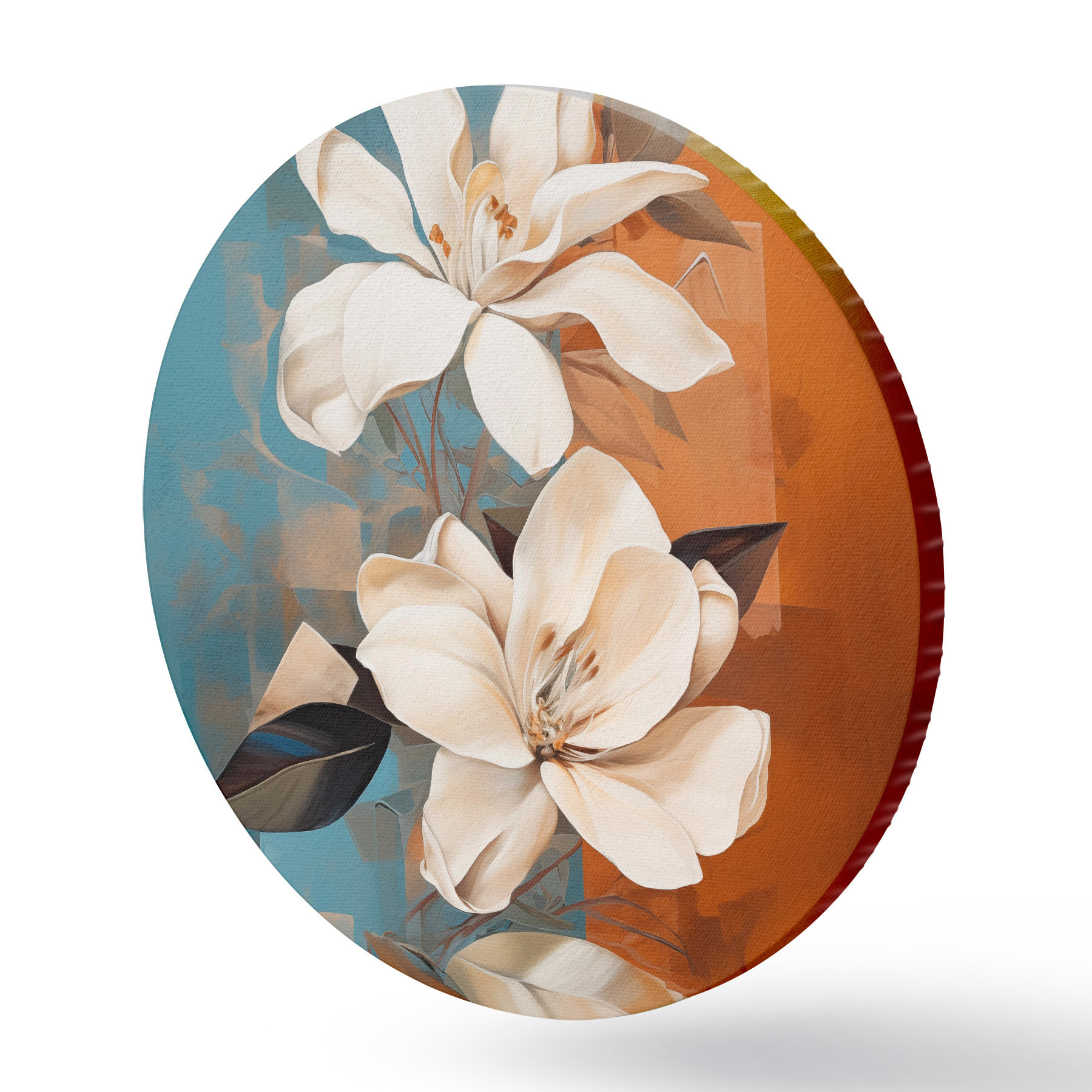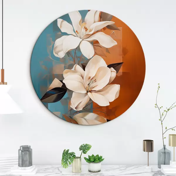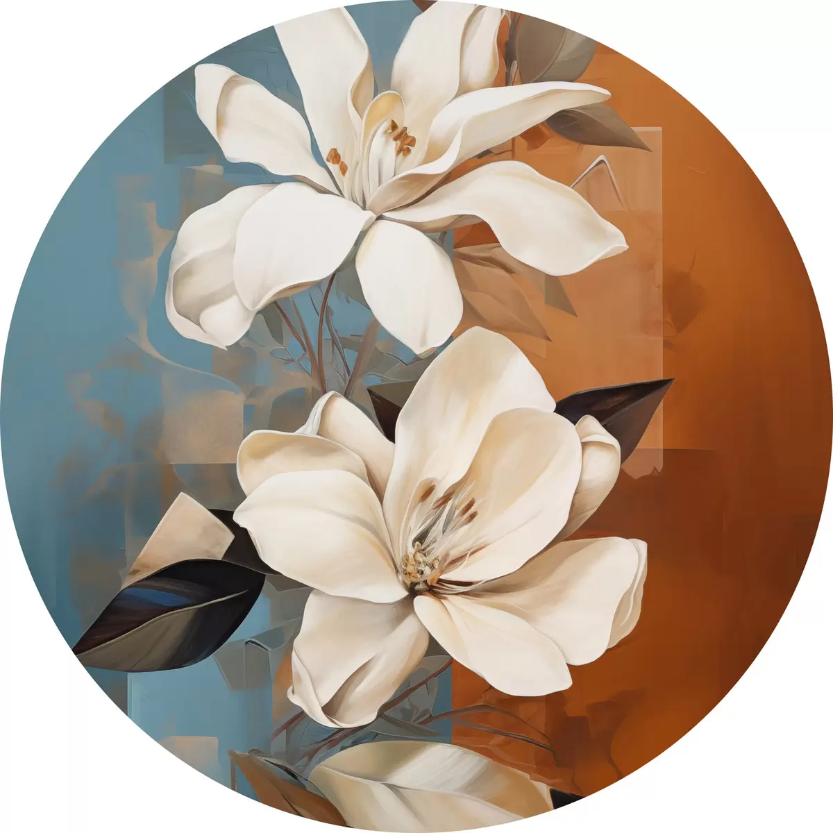 Quadri rotondi Fiori e foglie bianchi astratti su sfondo marrone e blu con forme astratte, in stile minimalista r46710