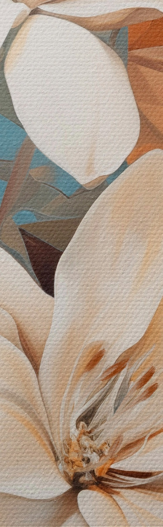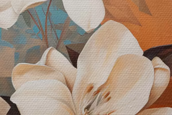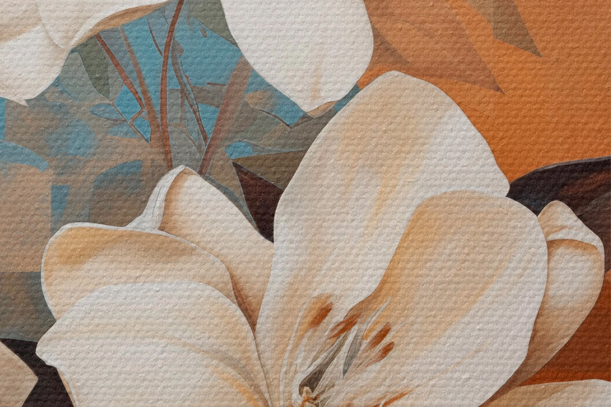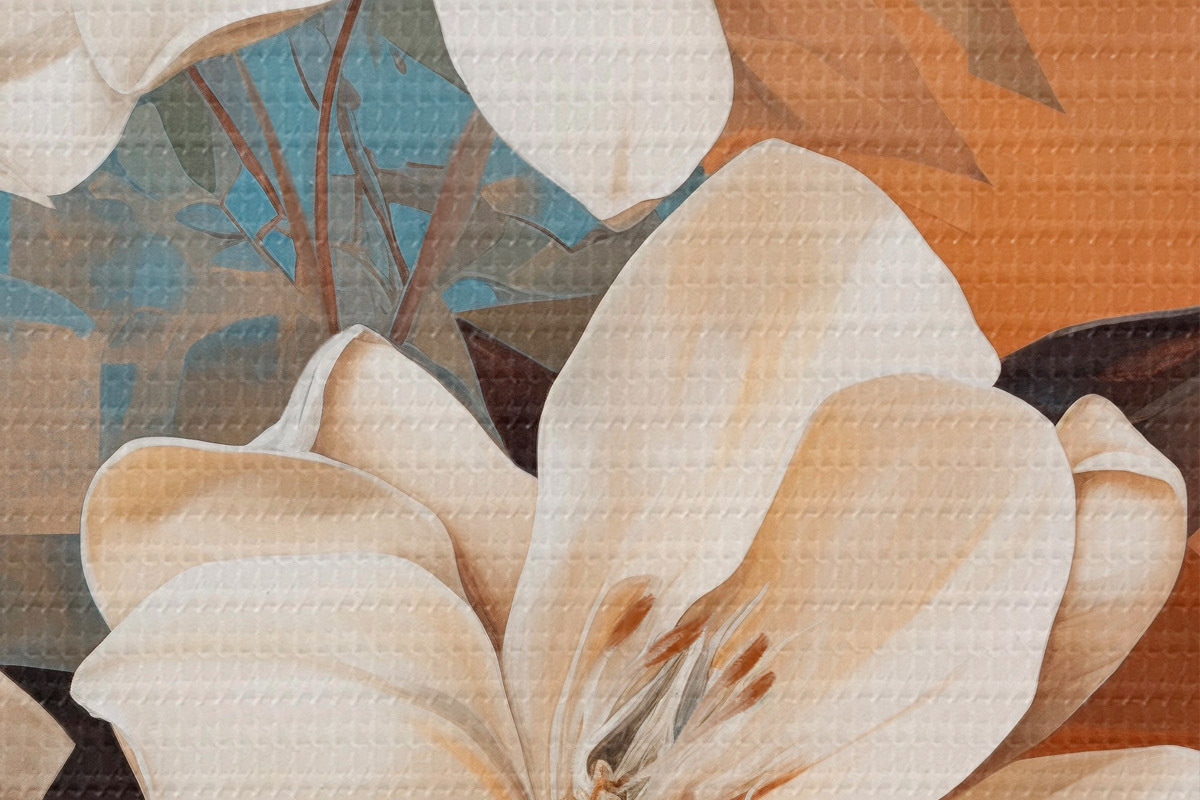 Immagine Fiori e foglie bianchi astratti su sfondo marrone e blu con forme astratte, in stile minimalista Nr r46710